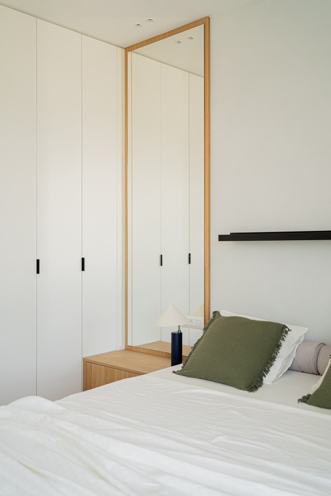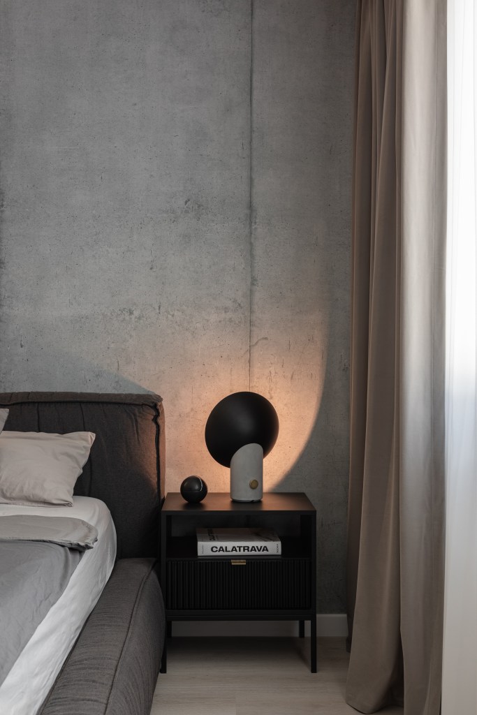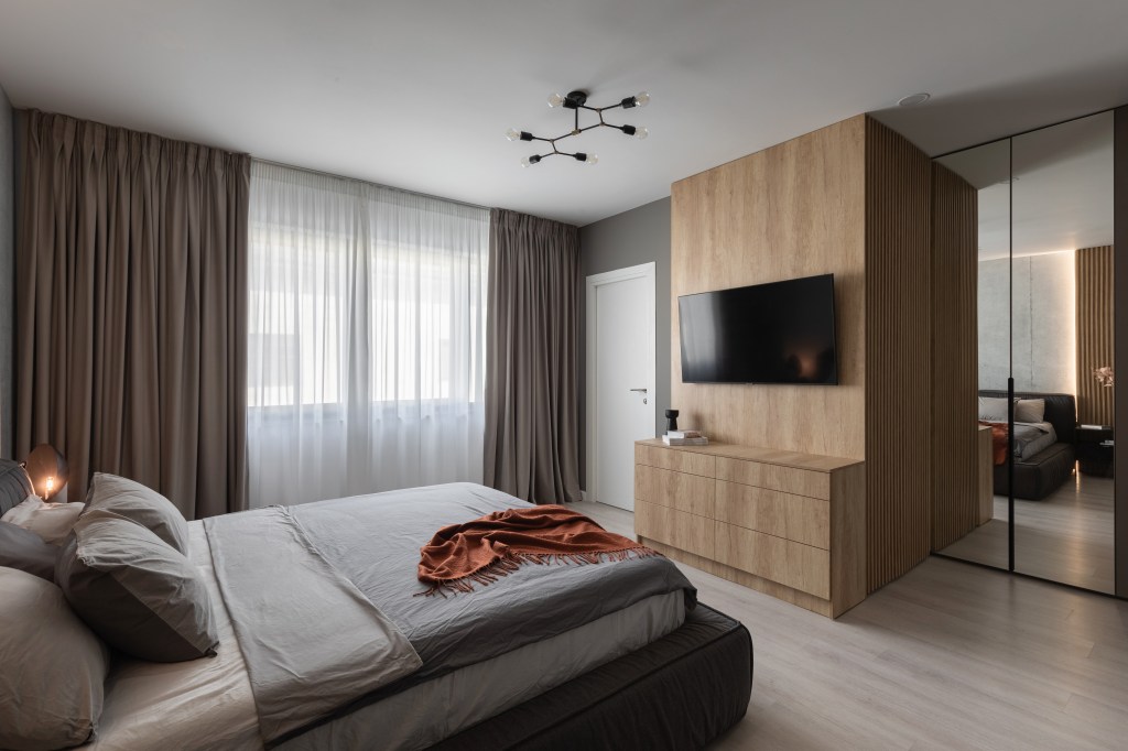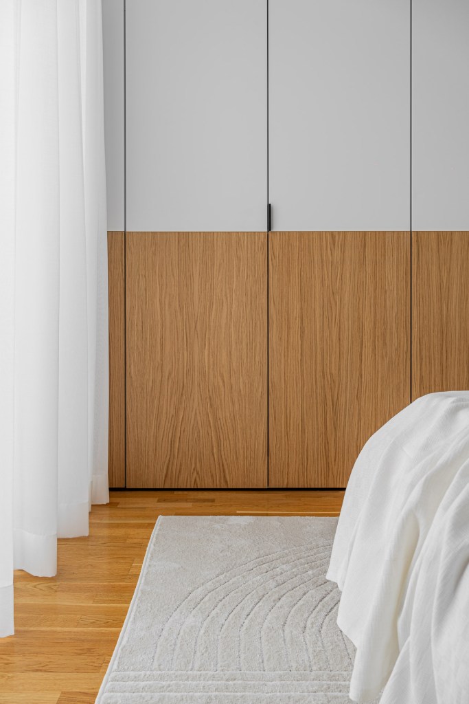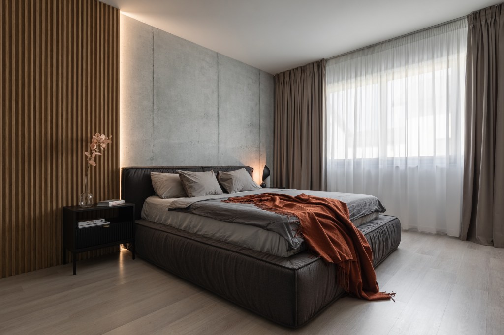 Combinarea riflajelor din lemn cu o vopsea decorativă cu efect texturat oferă profunzime și un aer luxos în dormitorul unui apartament modern, amenajat de arhitecta de interior Ștefana Delia. Ștefana a folosit acest mix pentru a defini zona de dormit, iar astfel a obținut un echilibru între liniile contemporane și materiale calde.