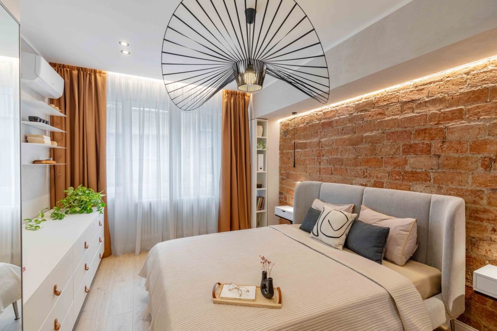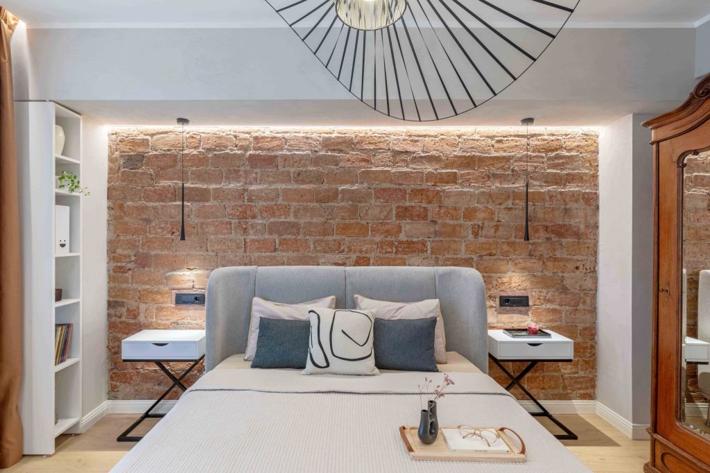 Cărămida aparentă nu este rezervată doar livingurilor. Într-un dormitor urban amenajat de arhitecta Maria Romanescu de la Fabritektura, ea aduce un contrast interesant între duritatea materialului și liniștea spațiului de odihnă. Maria a lăsat-o în nuanța naturală de roșu, pentru un efect cald, dar o poți vopsi în alb, pentru o notă scandinavă.