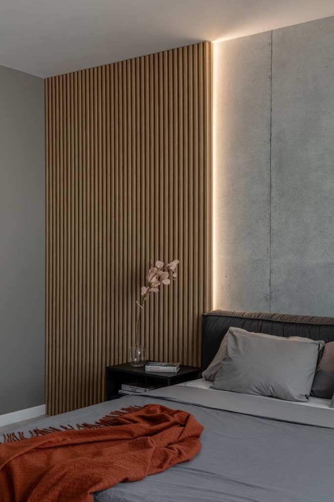 Într-un proiect contemporan, arhitecta Cosmina Nidelea au folosit panouri de lemn vertical, completate de o bandă LED ascunsă în spatele tăbliei ca idee de decor pentru un perete din dormitor. Rezultatul este o lumină indirectă plăcută, care conturează materialul natural și creează o atmosferă relaxantă, potrivită pentru serile liniștite.