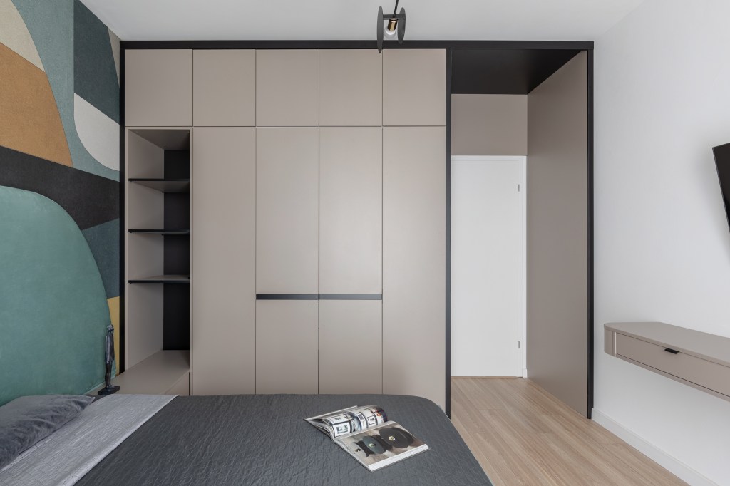 Culorile și formele abstracte pot dinamiza instant un dormitor minimalist. Într-un apartament de închiriat, arhitecta Cristina Ciobanu de la Formart Interior a folosit un tapet cu model geometric, reușind să ofere un aer artistic și sofisticat unui spațiu mic. Secretul este echilibrul: a lăsat restul camerei simplu, iar peretele decorat a devenit punctul de interes.