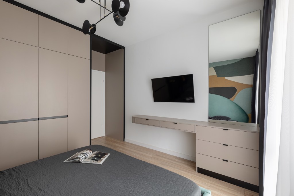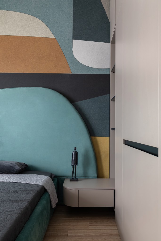 Dacă preferi un decor discret, dar jucăuș, poți folosi vopsea în două tonuri. Într-un proiect de apartament mic, designerul Alina Prunache de la Interiograf Studio a împărțit peretele patului între o nuanță pastel și un gri diafan, ceea ce a creat un contrast interesant și iluzia unui spațiu mai înalt. Este o soluție accesibilă și ușor de adaptat oricărui stil.