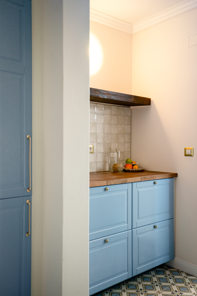 Într-un apartament interbelic din București, designerul Dana Marin de la Postcard Projects a ales o combinație de bleu, galben și crem pastelat pentru a păstra farmecul spațiului, dar și pentru a-l aduce într-o zonă contemporană.