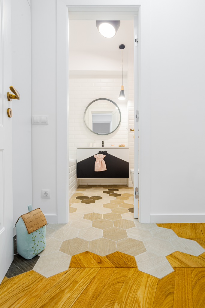 După partea de modificări, au trecut la amenajarea efectivă a spațiului. Au ales pentru pardoseală un model de parchet Chevron de la Kährs care, prin textura și nuanța sa, oferă spațiului dinamism și confort vizual. Pe hol și la intrarea în baia fetiței, pardoseala Chevron se îmbină cu plăcile de gresie.
