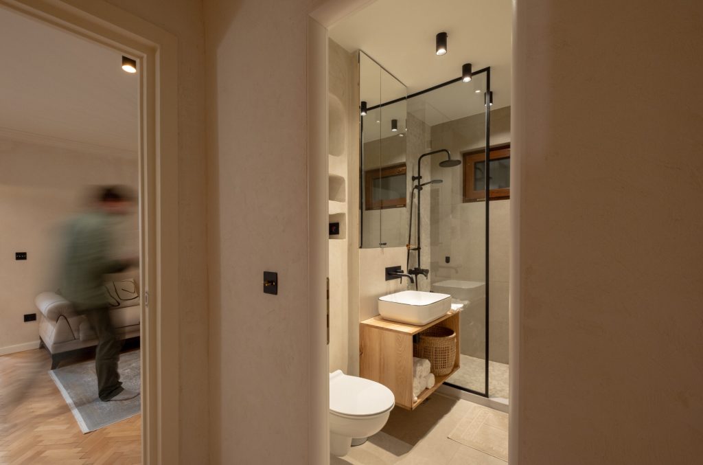 Baia unui apartament din București măsoară numai numai 3,42 metri pătrați. În procesul de reamenajare, designerii Ailin Menasan și Cristian Oătrașcu de la Cristian Pătrașcu Studio au reconfigurat-o complet, astfel încât să poată integra un duș walk-in. Pentru că în restul locuinței au folosit arcada ca motiv, aceștia au ales să o integreze și în baie, printr-un paravan de sticlă curbat. În rest, au folosit finisaje ceramice moderne, în nuanțe neutre, ușor întunecate.