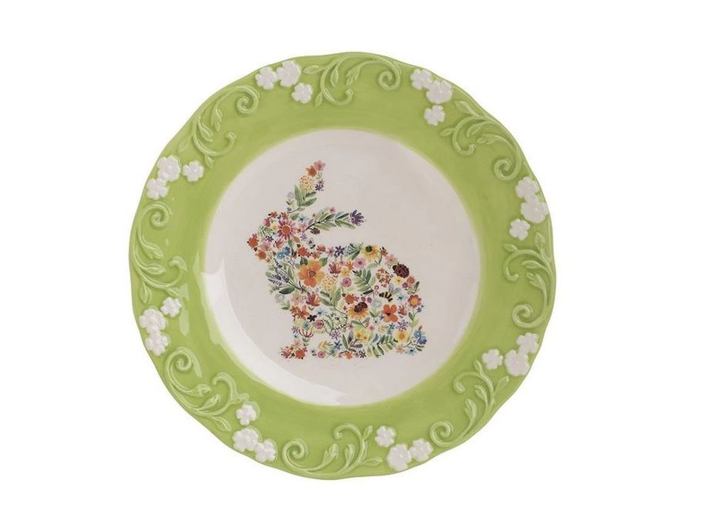 Câteodată cel mai ușor mod să decorezi masa de Paște este cu ajutorul farfuriile cu modele pascale. Noi a ales un model cu iepure și margini verzi cu flori pe care le poți folosi și un tea party în grădină după ce trec sărbătorile. Pune și câteva bibelouri cu iepuri pe masă pentru un decor complet.