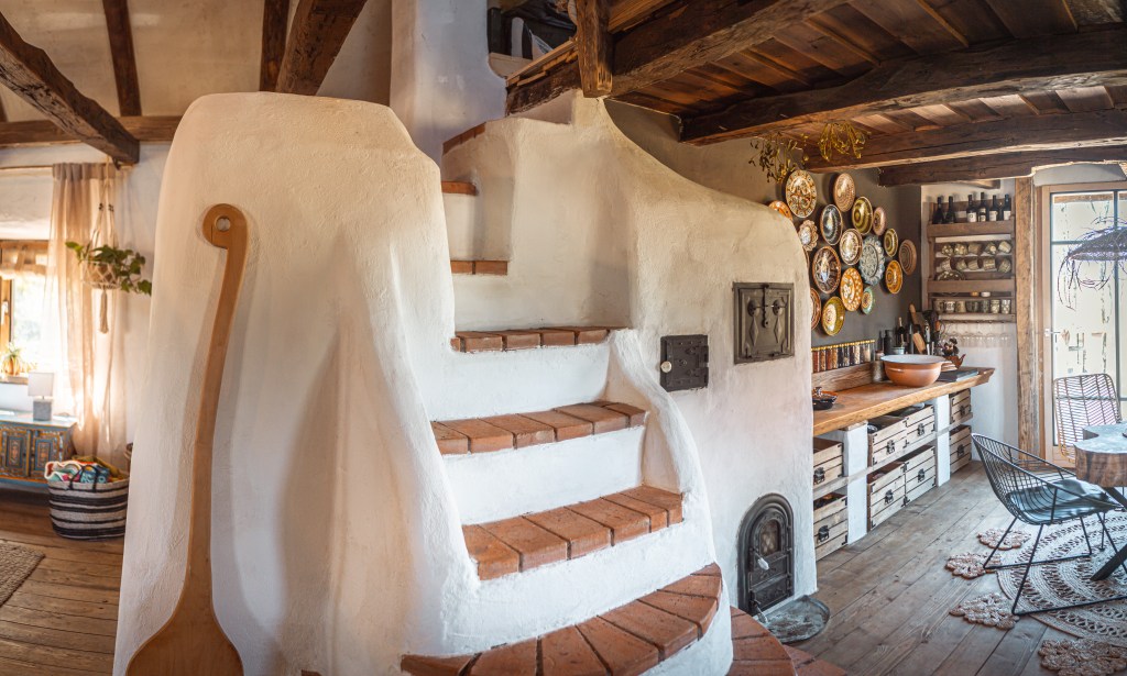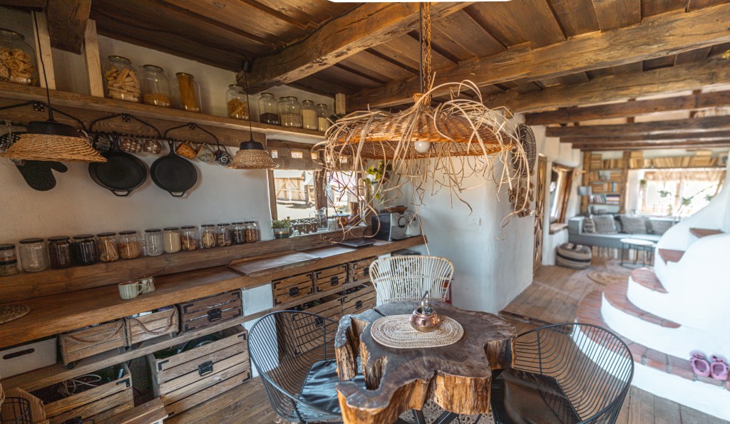 Înăuntru, căsuța arată ca scoasă din povești. Lemnul este vizibil peste tot și dă un aer rustic în combinație cu rotunjimile pereților specifici de casă la țară. Mobilierul e făcut din ei pe alocuri, cum ar fi canapeaua din bușteni din living. Au primit materialul de la o fabrică în faliment și au vrut să îl valorifice ca să fie sustenabili.