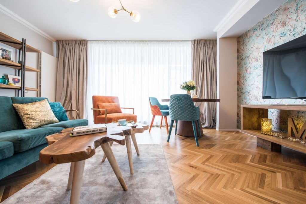 Pentru un apartament din București aflat într-un imobil premiat la Anuala de Arhitectură, designerul Magdalena Ancu a venit cu o amenajare într-o combinație de nuanțe calde și reci. Astfel, a combinat accente oranj cu unele bleu, iar cele două culori se regăsesc inclusiv în tapetul cu imprimeu floral pe care l-a aplicat pe unul dintre pereții livingului open space. Poți vedea întreaga amenajare în acest articol.