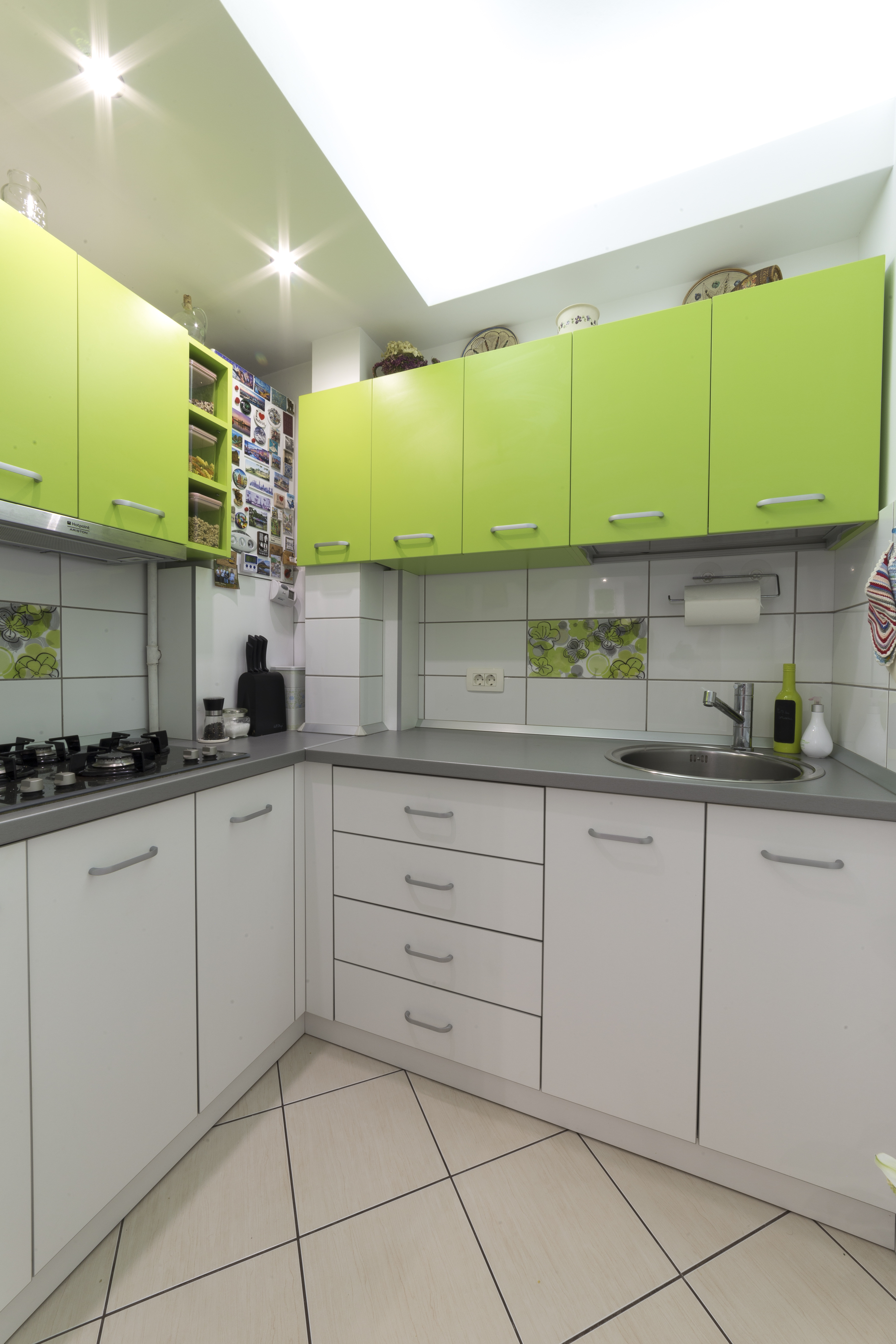 Albul este culoarea predominantă și în bucătărie, căci lasă impresia de spațiu, iar monotonia este „spartă” de nuanța verzuie a dulapurilor de deasupra blatului. Efectul este cel scontat: nu simți că încăperea e aglomerată, iar impactul vizual e unul plăcut.