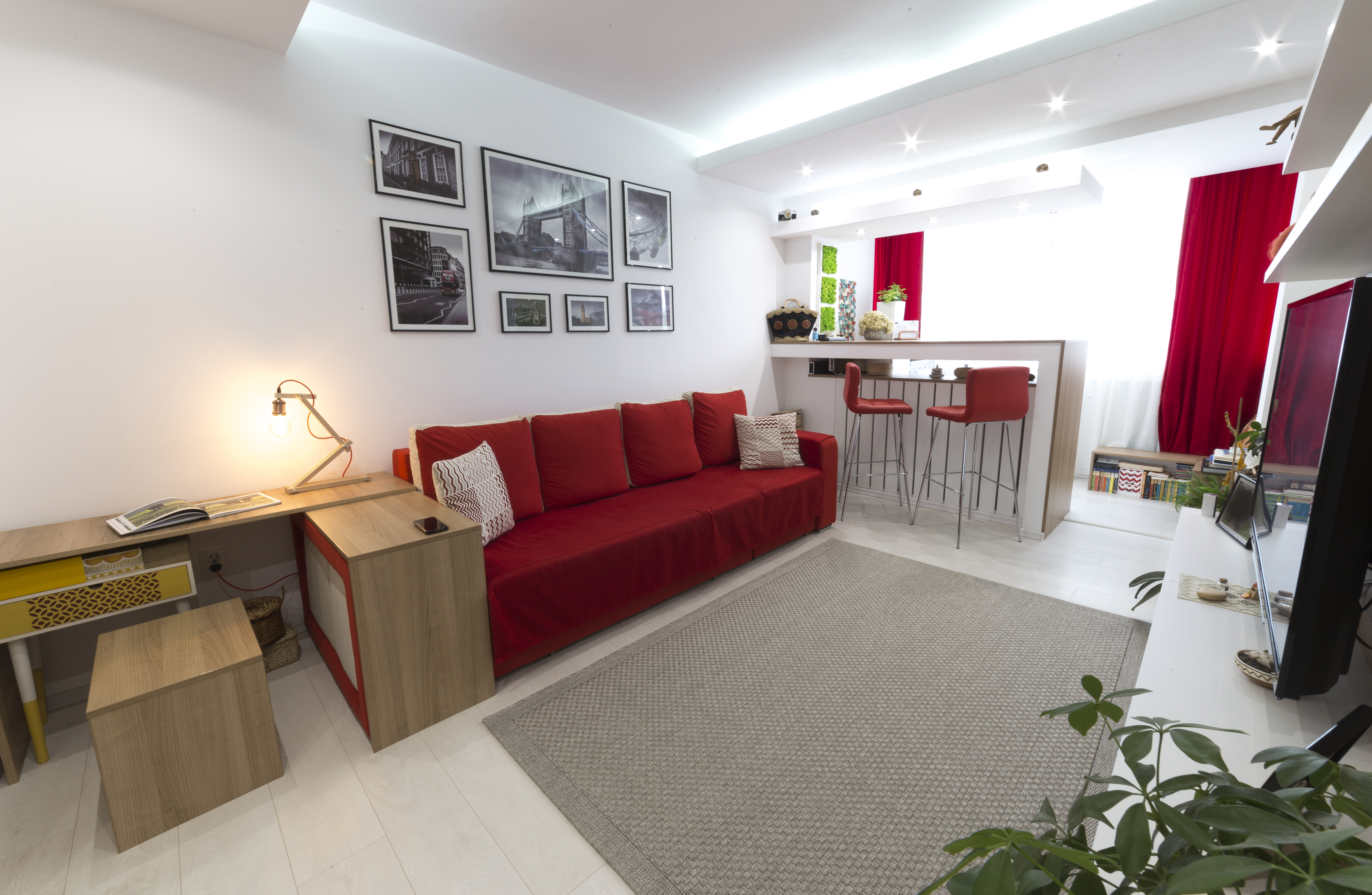 Au primit ajutor de la Bogdan Sebastian Socol, un designer român stabilit în Suedia. El s-a ocupat de tot ce înseamnă forma pereților, lumină, compartimentare, mobilier și alegerea culorilor, astfel încât spațiul de 32 metri pătrați să fie pus în valoare într-un mod inteligent și totodată să arate și frumos.