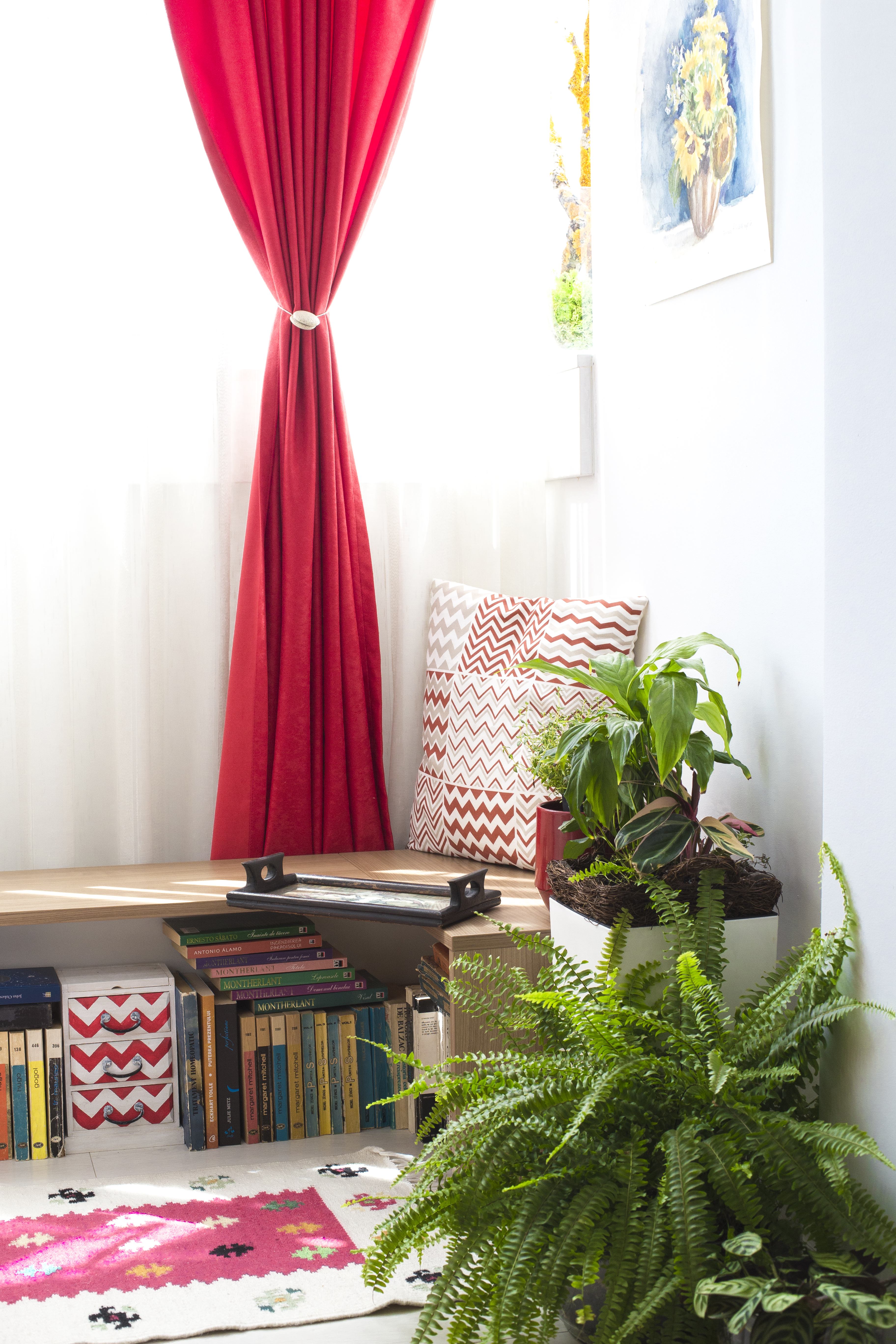 În cameră, tonurile au fost alese astfel încât să se completeze reciproc. Tavanul și pereții sunt albi, iar podeaua are tot o nuanță deschisă. Acestea contrastează cu canapeaua de un roșu aprins, care concentrează toată atenția atunci când pășești înăuntru. Balanța culorilor e echilibrată de nuanța maronie a lemnului din care care sunt realizate panoul din spatele televizorului, biroul, dulapul de haine și câteva spații de depozitare mai mici. De asemenea, depozitoarele din stuf sunt realizate manual. Pentru a păstra tonalitatea, deasupra canapelei sunt așezate tablouri alb-negru, în timp ce ghivecele cu plante mai „înverzesc” puțin atmosfera.
