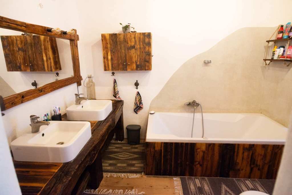 Tot el a tencuit pereții din baie cu tadelakt, o tehnică pe care a învățat-o în Ungaria și care i-a permis să renunțe la placarea tradițională cu ceramică. Din punct de vedere al costurilor, Koszta spune că o construcție din baloți de paie nu este neapărat mai ieftină decât una din materiale convenționale. Avantajele sunt însă multiple, crede el: ai parte de un mediu de trai sănătos și reduci substanțial cheltuielile de întreținere.