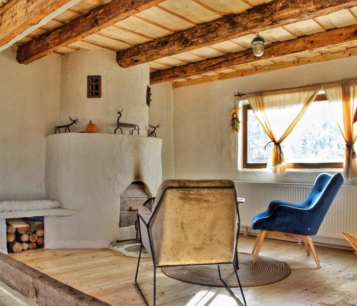 Ana a fost cea care s-a ocupat de amenajarea interioară a căsuțelor din lemn. A ales, pentru fiecare, un stil diferit care să le pună cât mai bine în valoare trecutul. Touși, nu a vrut să ducă lucrurile într-o zonă previzibilă de tradițional. În schimb, a folosit obiecte vechi, păstrate în familie de generații sau piese adunate, de-a lungul timpului, din diverse piețe sau târguri de antichități. Le-a integrat armonios în amenajare, păstrând spațiile minimaliste și cozy. În toate cele patru căsuțe, a folosit o cromatică neutră, inspirată din peisajul de afară. De asemenea, a apelat la materiale naturale pentru a sugera ideea de tihnă și simplitate. Ana își amintește cu drag de această etapă a proiectului. Recunoaște că a avut mari emoții să se ocupe de tot fără consiliere de specialitate. Leonid a fost însă cel care a încurajat-o să își pună ordine în idei și să aibă încredere în propriul simțul estetic.