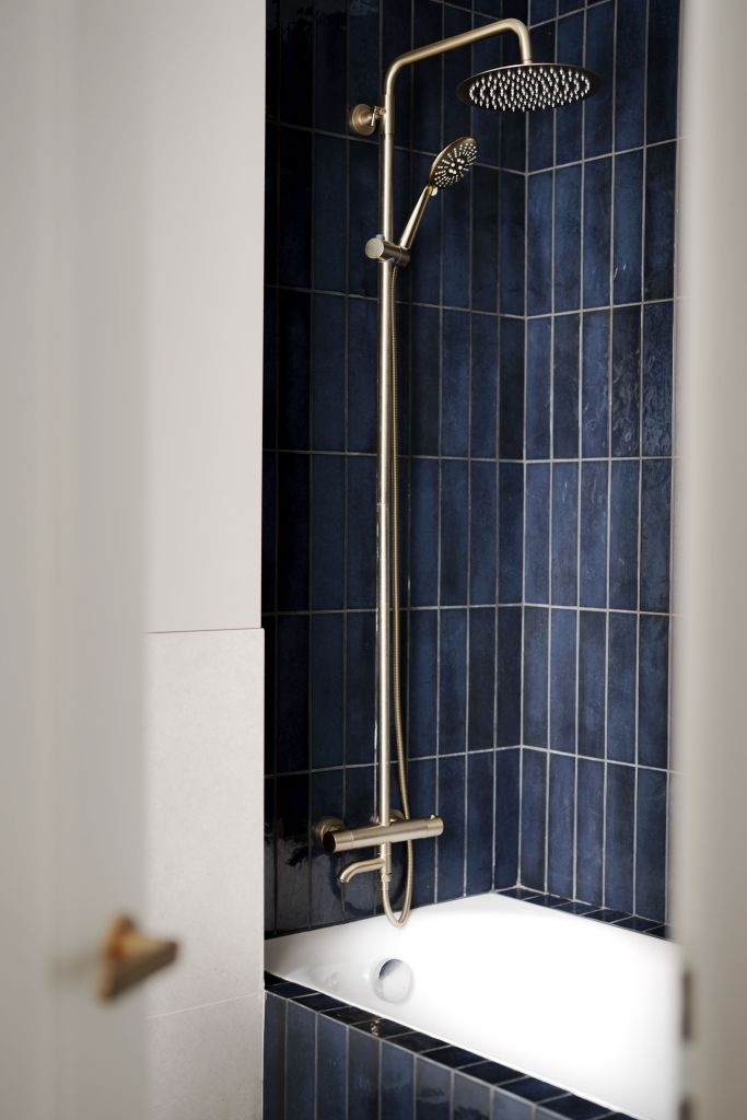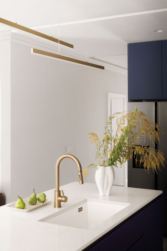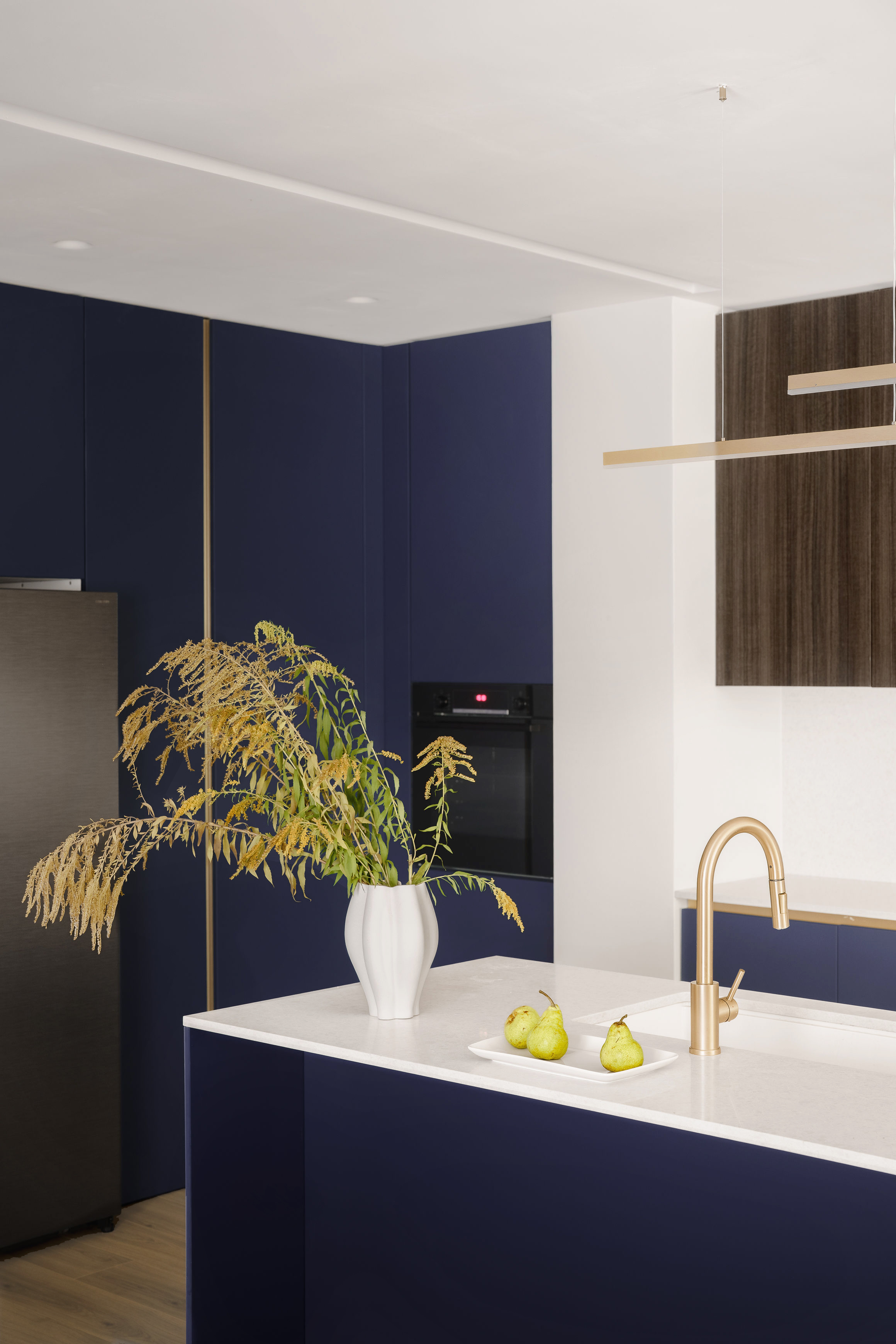 Bucătăria este încăperea preferată a beneficiarilor. Mobilierul este realizat pe comandă din MDF, vopsit într-o nuanță intensă de albastru și pal cu textură de lemn. Aspectul modern, minimalist este dat de liniile simple și de absența mânerelor. Spațiul este perfect organizat prin depozitări închise care nu lasă nimic la vedere. Blaturile sunt din quartz compozit, o cerință a beneficiarilor care și-au dorit un interior cu materiale ușor de întreținut. Accesul în cămară vine cu o abordare creativă. Aici arhitecta Mara Alexandra a gândit o intrare secretă, integrată în mobilierul din bucătărie, între frigider și cuptoare. Accentele aurii sunt detalii care completează decorul elegant al bucătăriei.