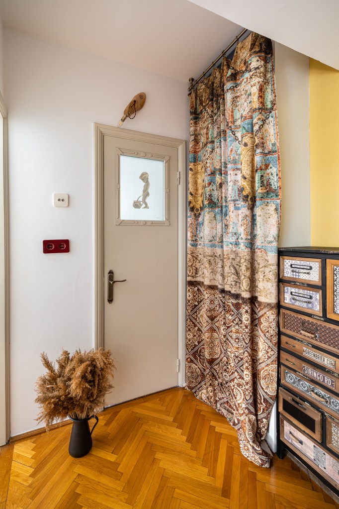 Alina a înlocuit debaralele din hol, renunțând complet la structura masivă din pal pe care a găsit-o la cumpărarea apartamentului. Nu le-a desființat pentru că, spune ea, ar fi fost păcat să sacrifice spațiu de depozitare atât de valoros într-o familie cu doi copii, dar a găsit o formulă de prezentare mult mai apropiată de stilul ei. Soluția a fost să mascheze interiorul cu draperii de la Vladila. Inițial, avea de gând să facă, pe comandă, dulapuri înalte cu uși de ratan, dar a fost descurajată de prețuri, așa că a făcut un compromis cu rezultat mult peste așteptări.