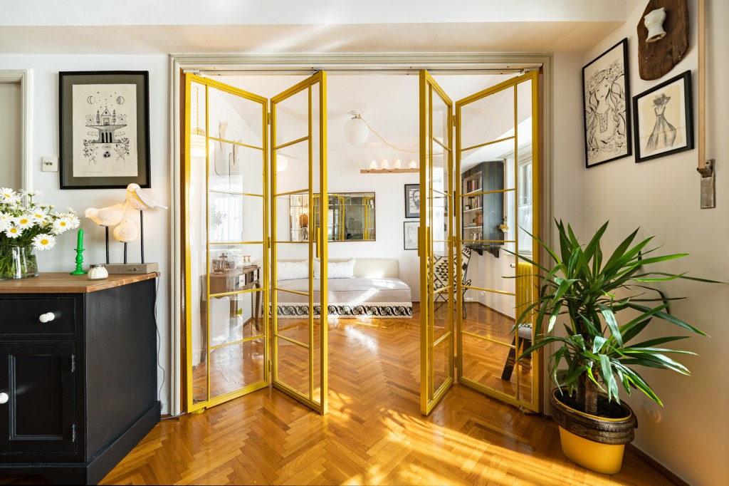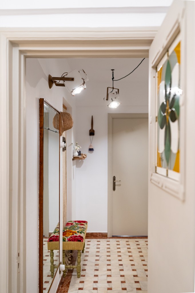 Din punct de vedere al compartimentării, nu i-a adus modificări. A păstrat ușile de interior, dar au avut nevoie de șlefuire serioasă și de un strat generos de vopsea grej ca să-și recapete frumusețea. Alina nu a lăsat nici un detaliu la voia întâmplării. Ușile din hol și din bucătărie au vitralii pictate de buna sa prietenă, Cristina Ecobici. Întreaga amenajare este un mix de nou și vechi, de elemente etnice aduse în contemporan, de mici proiecte de upcycling care dau originalitate spațiului.