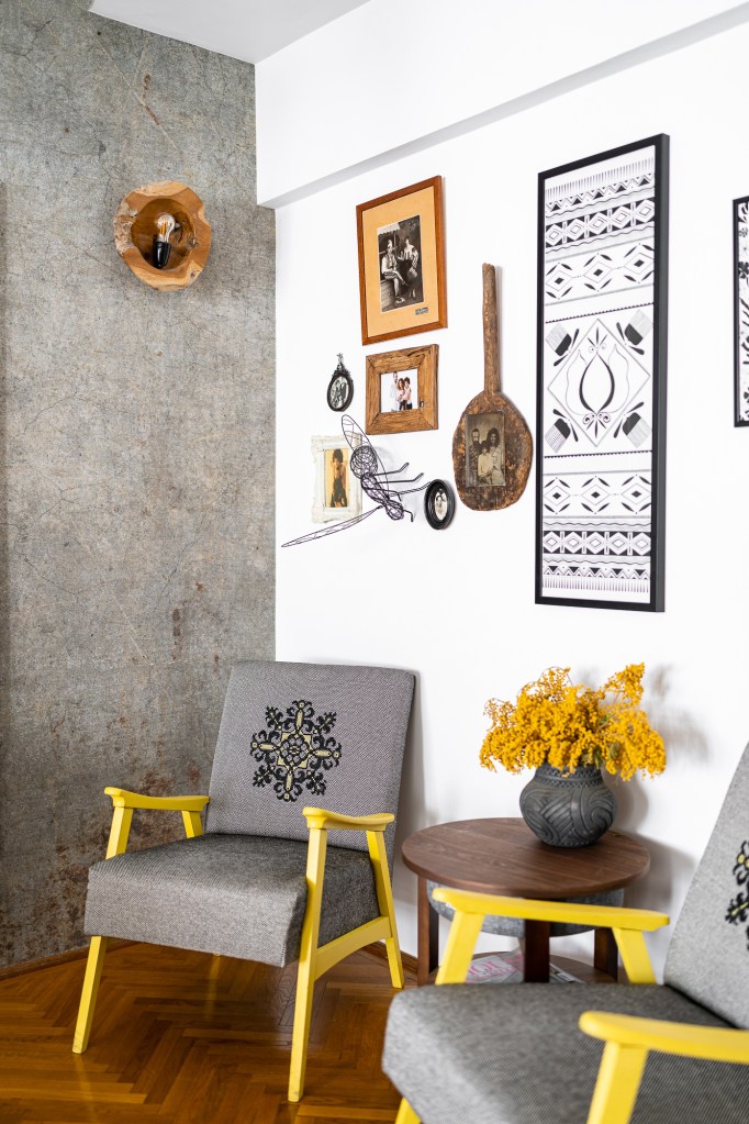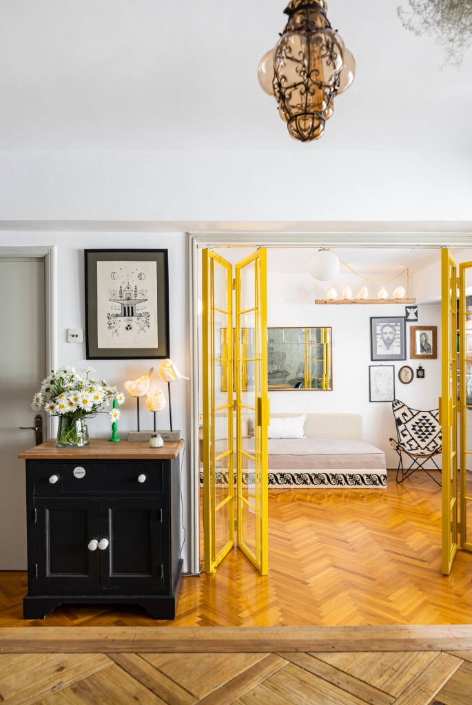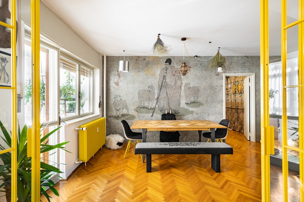 Amenajarea din zona de dining păstrează aceeași idee de mix and match care integrează elemente de inspirație etnică. Bancheta și fotoliile sunt rezultatul unei colaborări cu N’atelier de Producție, iar corpul de iluminat de deasupra mesei este cumpărat de pe OLX. Alina a folosit galbenul ca pată de culoare în această încăpere – caloriferul de fontă și ușile armonice, cu cadru metalic. Peretele accent este vedeta amenajării datorită tapetului de la Vladila.