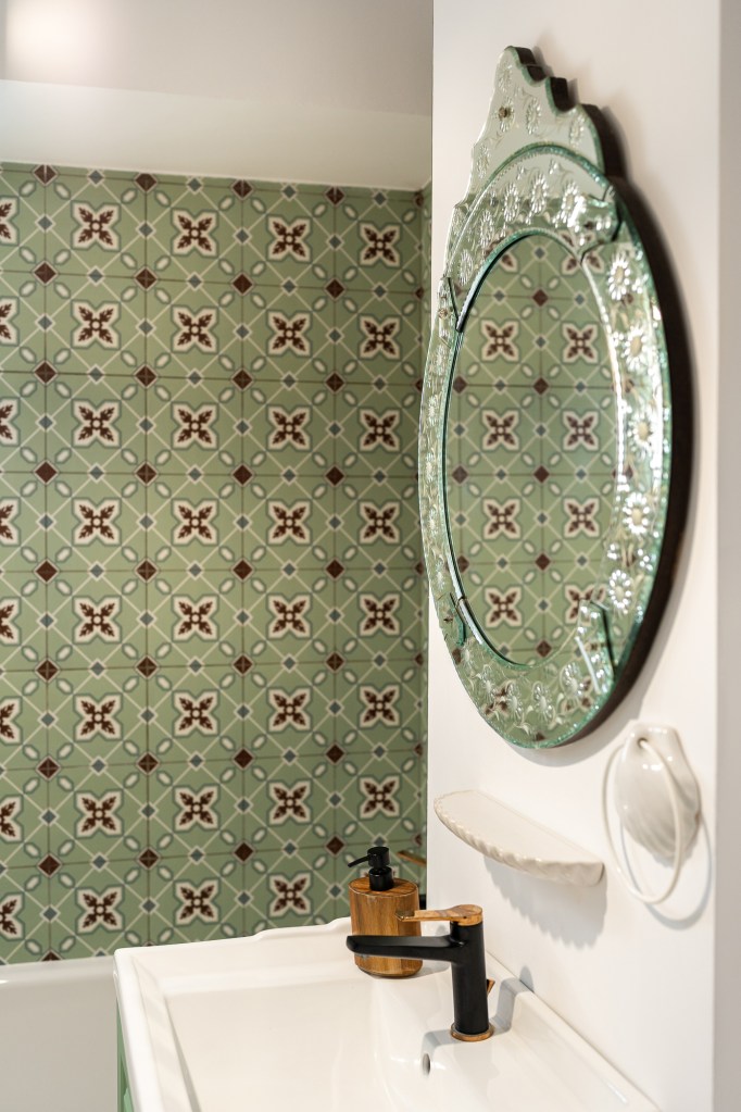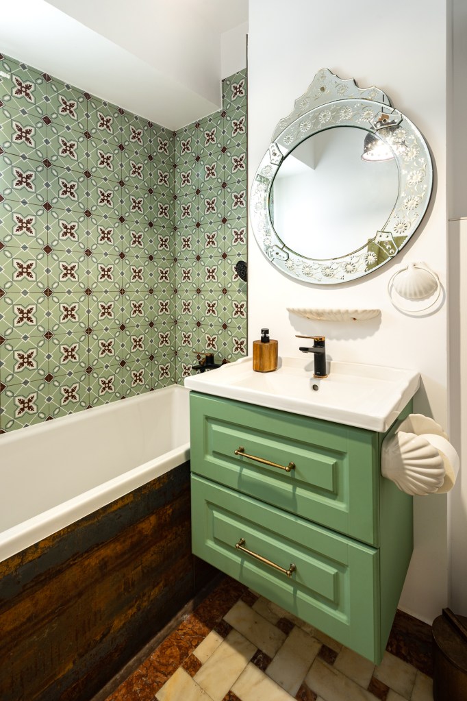 În baia matrimonială, regăsim accentele de verde oliv, la fel ca în bucătărie. Corpul de iluminat din ceramică este cumpărat de la Deco Republic. Deși s-a atașat foarte tare de acest loc, Alina nu exclude varianta mutării. Nu crede că poate renunța, pe termen lung, la camera în plus care îi lipsește. De altfel, a și listat apartamentul pe un site cu anunțuri imobiliare . Oricum, nu-i displace perspectiva începerii unui alt proiect. Ba dimpotrivă! Abia așteaptă să-și pună amprenta asupra unui spațiu nou.