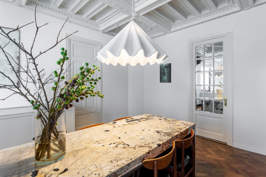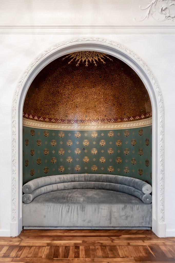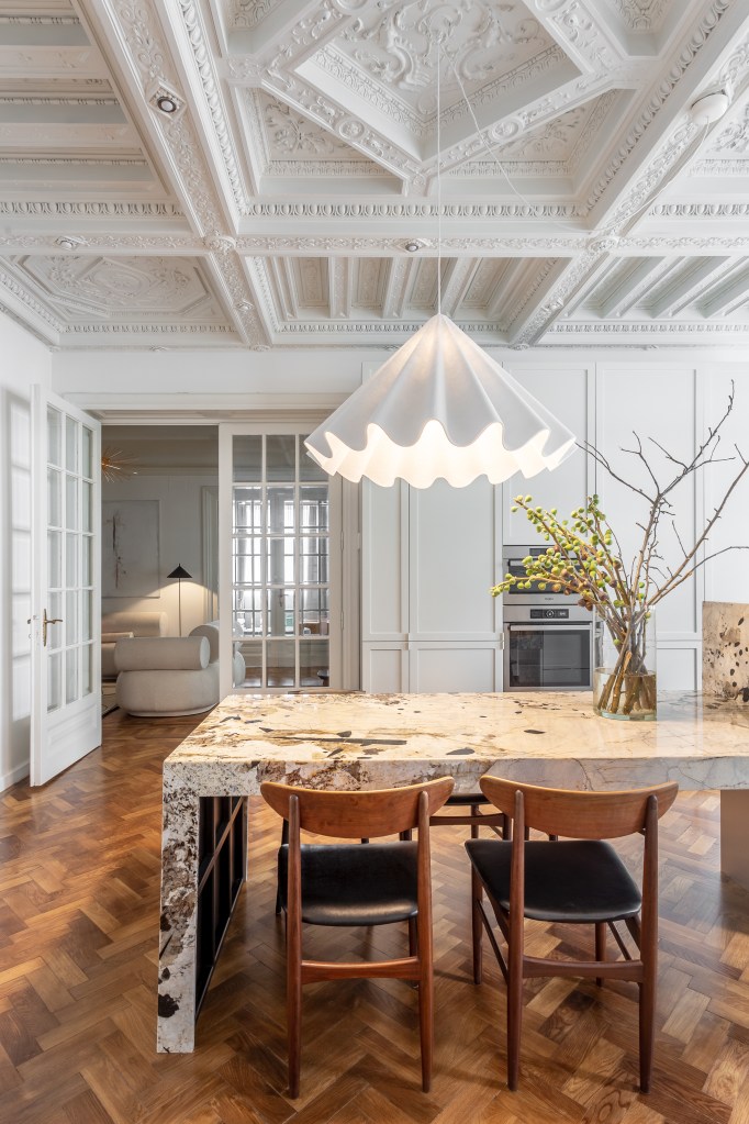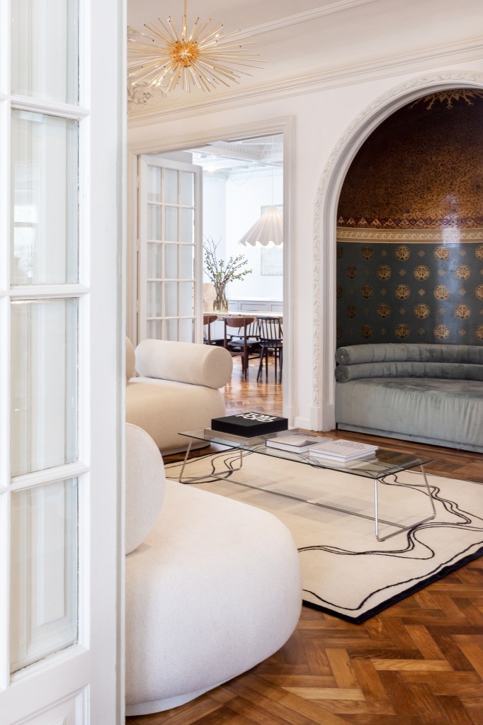Piesele de rezistență ale apartamentului sunt reprezentate de tavanele foarte decorate și păstrate în perfectă stare, dar și firida din zona de living, care era folosită cu rol decorativ. Tavanele sunt făcute din ipsos pictat, nu din lemn, și sunt ornate cu stucaturi cu mascaroni, cu motive geometrice și florale. Dacă vă doriți să creați și voi un astfel de tavan, aveți oricând posibilitatea de a merge la vestita ipsosară Maria Rădulescu în al său atelier de pe Calea Griviței 43 și să dați o comandă potrivită gusturilor și interioarelor voastre. Revenind la decorații, mascaronii sunt figure alegorice și înainte vreme aveau rolul de a proteja casa de spiritele rele. Facem astăzi un arc în timp și le regăsim pe o multitudine de imobile valoroase din capitală, atât la exterior cât și la interior.