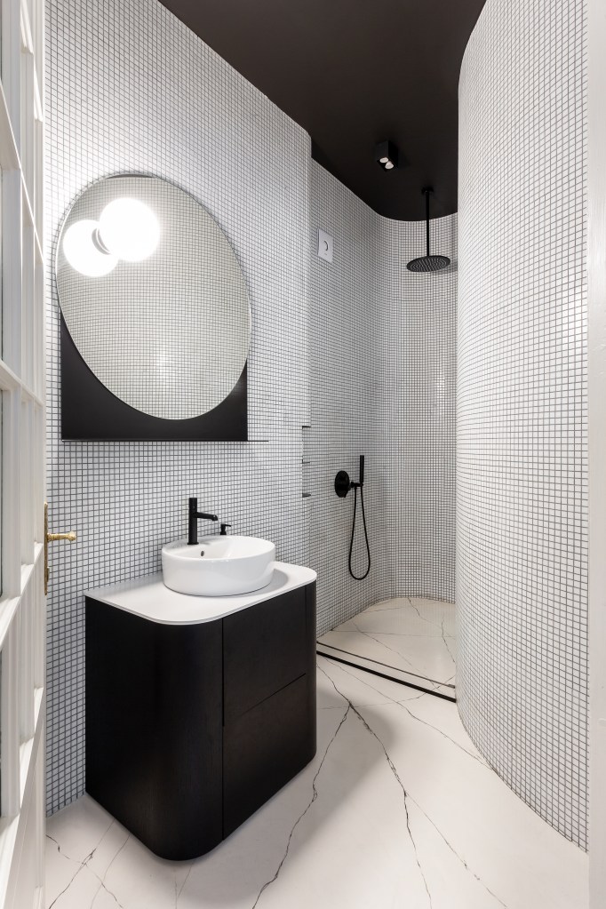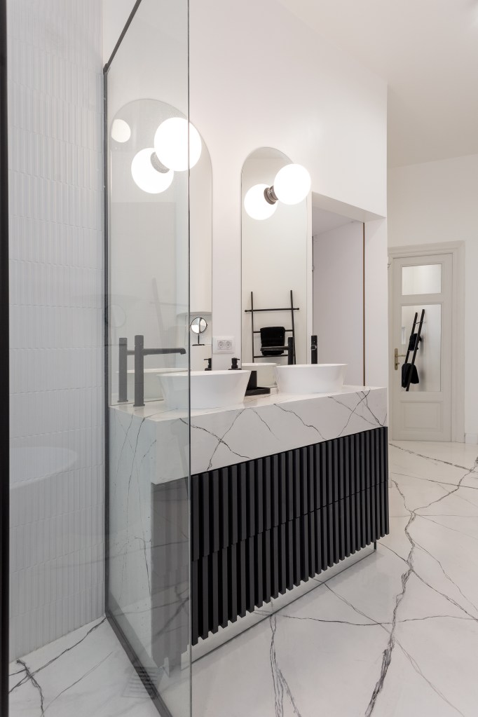 Inițial au vrut să folosească pentru băi plăci de ceramică foarte mari, numite Florim. Dar băile refuncționalizate au o formă atipică, ceea ce ar fi însemnat tăierea excesivă a plăcilor, aruncarea unei mari cantități de “resturi” nefolosite de plăci și lipsa unei continuități în ceea ce privește modelul. Pentru a nu genera risipă nenecesară, au decis să toarne șapă epoxidică autonivelantă pe care meșterul a turnat-o și a modelat-o astfel încât să trimită cu gândul la marmură. În acest fel, arată ca și cum ar fi fost turnată dintr-o bucată, este uniformă și rezistentă la umezeală, și s-a potrivit mai bine și bugetului lor.