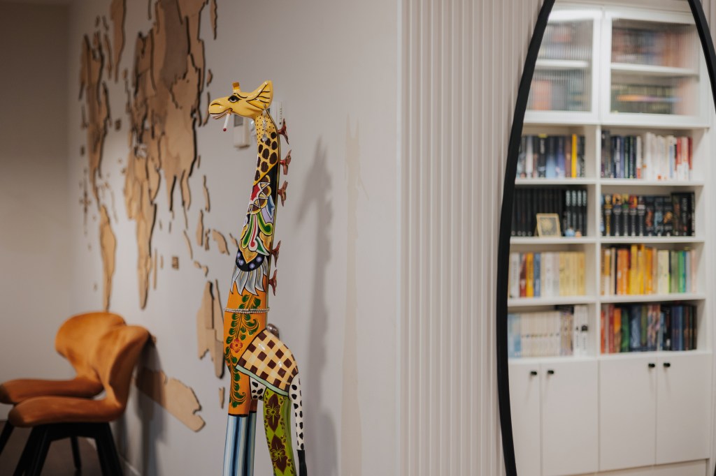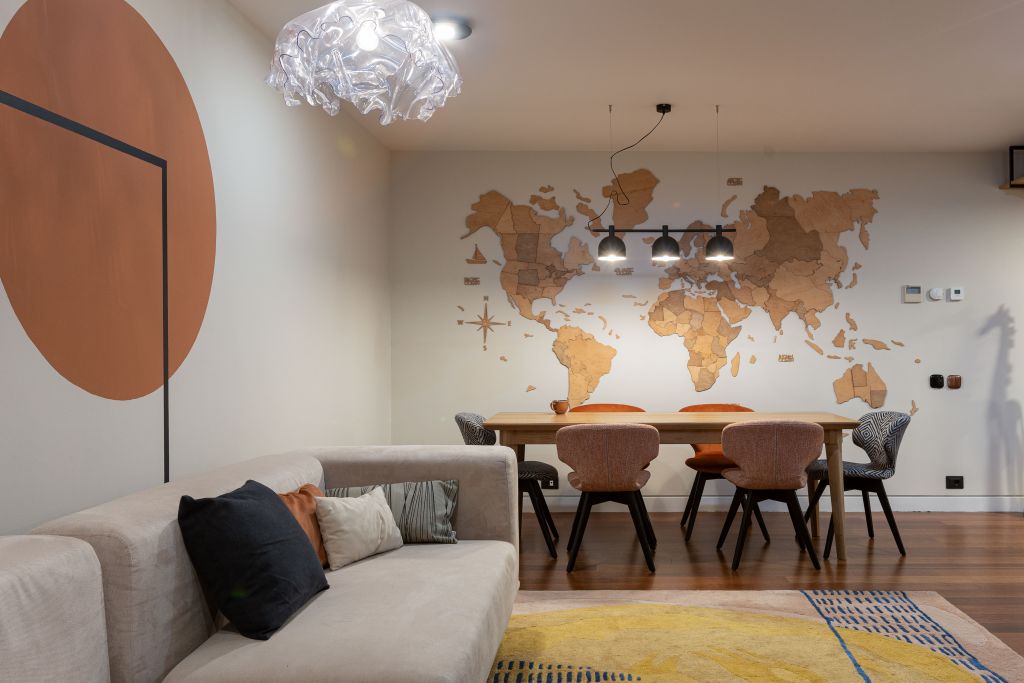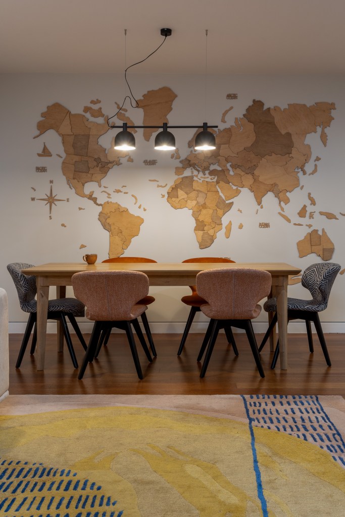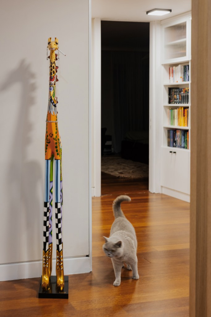 „Am încercat să mă pliez cât am putut de bine pe dinamica clienților mei. Ana și Dan o au pe Daria, fetița lor și pe Alma, pisica familiei. Am vrut ca fiecare colț al apartamentului să țină cont de interacțiunea lor și de stilul lor de viață. Primul lucru care îmi vine în minte este masa de dining, prevăzută cu un sertar mascat pe toată suprafața. Este un loc gândit special pentru depozitarea pieselor de puzzle, aceasta fiind, de altfel, una dintre activitățile preferate ale beneficiarilor. A, și un alt element îndrăgit de toată familia este Sophie, girafa din living, a cărei responsabilitate este să aducă un zâmbet pe față tuturor celor care o privesc”, spune Laura.