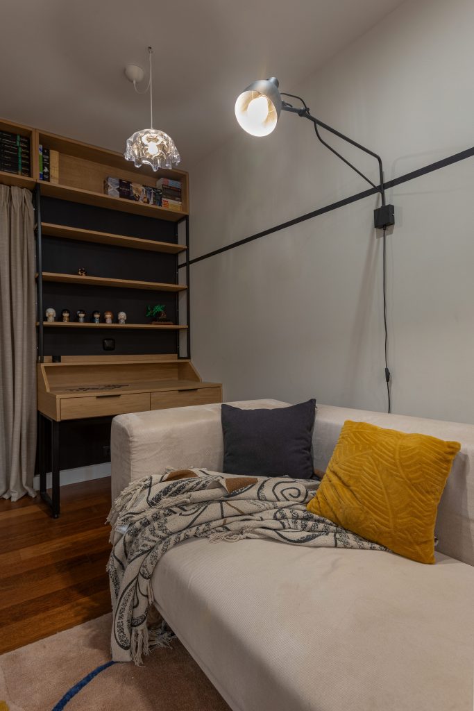 Un lucru important de care Laura a trebuit să țină cont în acest proiect a fost optimizarea spațiului. Beneficiarii au punctat încă din brief că vor ca totul să aibă utilitate, să existe ergonomie și funcționalitate, mai degrabă decât statement ornamental. Își doreau cât mai multe spații de depozitare, dar configurate într-o manieră care să nu distragă atenția de la estetica generală. Nu a fost tocmai simplu, având în vedere că proprietarul are aproape 30 metri liniari de cărți. Soluția salvatoare a fost mobilierul personalizat care a păstrat decorul aerisit și coerent. Laura s-a folosit de rafturi suspendate pe care le-a poziționat inclusiv deasupra ușii, asigurându-se astfel că scoate maximum din spațiul disponibil. În living, mai ales, mobilierul este sleek, cu un aer ușor industrial, sugerat de inserțiile metalice. Tot mobilierul din casă este realizat, pe comandă, de Slender Tree, mai puțin cel din camera fetiței.