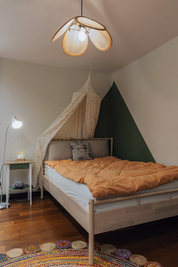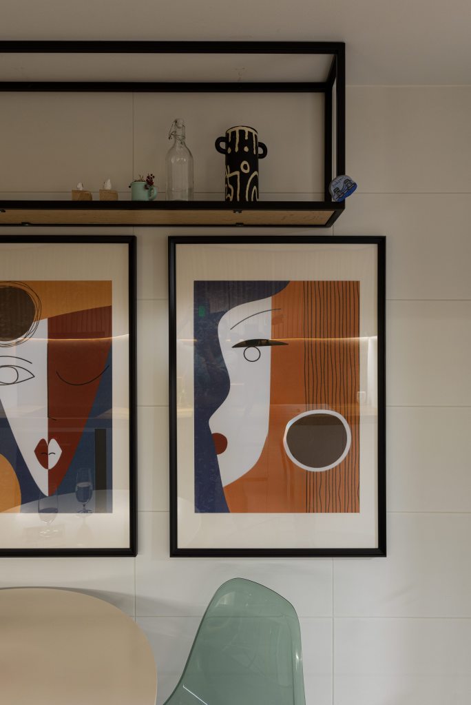 • Personalizare prin culori. Ana, proprietara apartamentului, a fost foarte implicată în personalizarea pereților, DIY-ul find un domeniu care chiar îi place. Împreună, am venit cu această idee de a ne folosi de forme geormetrice și de pete de culoare pentru a eleva decorul. Tot cu ajutorul culorii, am reușit să mascăm grila de aerisire de deasupra trecerii spre hol.
