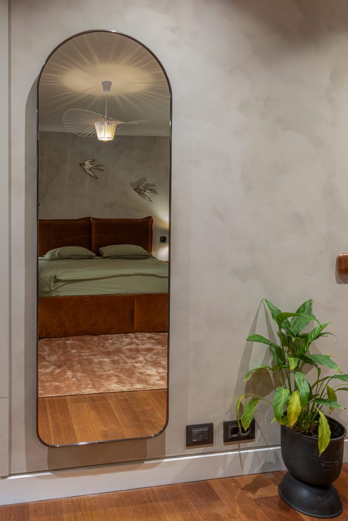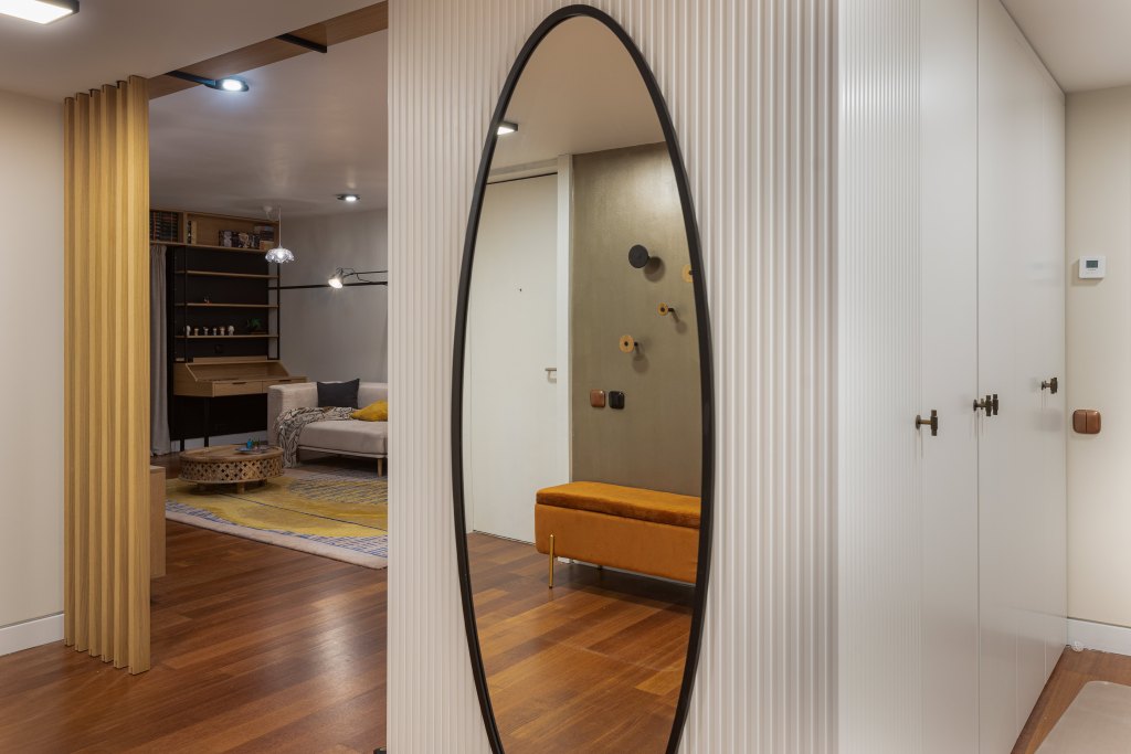 • Detaliile pot face diferența. În acest apartament, livingul era deschis către hol. Am creat o intrare mai intimă în living, folosind riflaje groase de lemn. Apoi am poziționat strategic un element decorativ foarte drag beneficiarilor: girafa Sophie. Am placat capătul de dulap din hol și peretele din continuarea sa cu panouri riflate pentru echilibru vizual. Pentru contrast, am folosit oglinda cu ramă metalică.