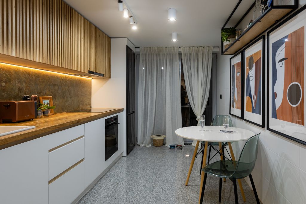 Cum a obținut designerul o amenajare caldă în apartamentul unei familii tinere, în ciuda finisajelor anoste alese de dezvoltator