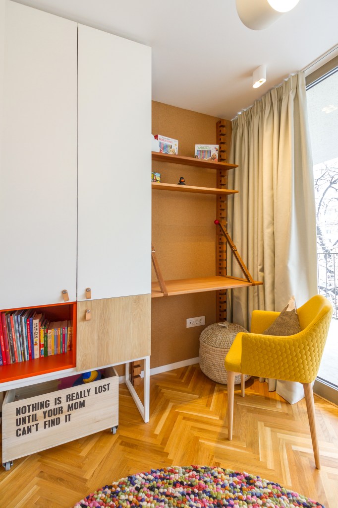 Natalia a gândit camera fetiței pe termen mediu, cu o depozitare care ține cont de faptul că ea va crește, unde să încapă haine, cărți, jucării, și a integrat elemente interactive: tapet magnetic GroovyMagnets de la XT Deco, și o porțiune de perete pe care să poată scrie cu cretă.