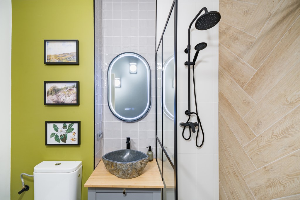 Deși nu are fereastră, baia este un spațiu luminos. „Am optat pentru iluminat cu spoturi, însă mi-am făcut de cap cu ledurile”, spune designerul. Mai exact, a coborât tavanul și a creat o nișă deasupra dușului pentru a integra leduri, pe care le-a reluat și în spatele oglinzii, și sub mobilierul pentru lavoar.