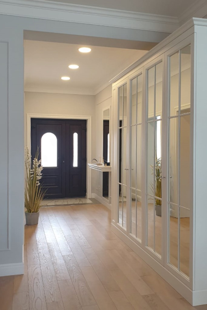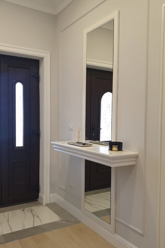 Pe hol, Raluca a cerut confecționarea unei oglinzi înalte, secționate de consola foarte utilă pentru tăvițe cu chei. În continuare acesteia, a realizat un dulap care are pe lateral agățătoare pentru hainele uzuale și o zonă închisă cu uși- oglindă, pentru a ascunde umerașe și polițe pentru încălțăminte.
