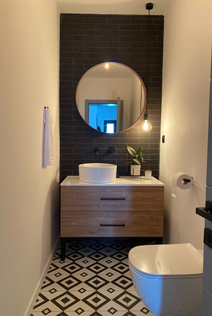 Cel mai mare răsfăț: Bucătăria este făcută pe comandă de cei de la Giomob. A fost clar cea mai costisitoare parte a amenajării, nu am prea făcut compromisuri. Mi-am dorit extrem de mult blat din quartz pentru insulă și nu am renunțat în ciuda costurilor ridicate. De asemenea, mi-am dorit masă din lemn de stejar. Aici mi-a fost imposibil să mă încadrez în buget. Am găsit o soluție de avarie: am cumpărat piciorul și blatul separat, iar soțul meu a asamblat totul, apoi finisat blatul. Căzile de baie freestanding intră și ele la categoria „răsfăț”.