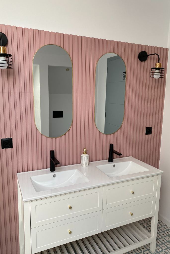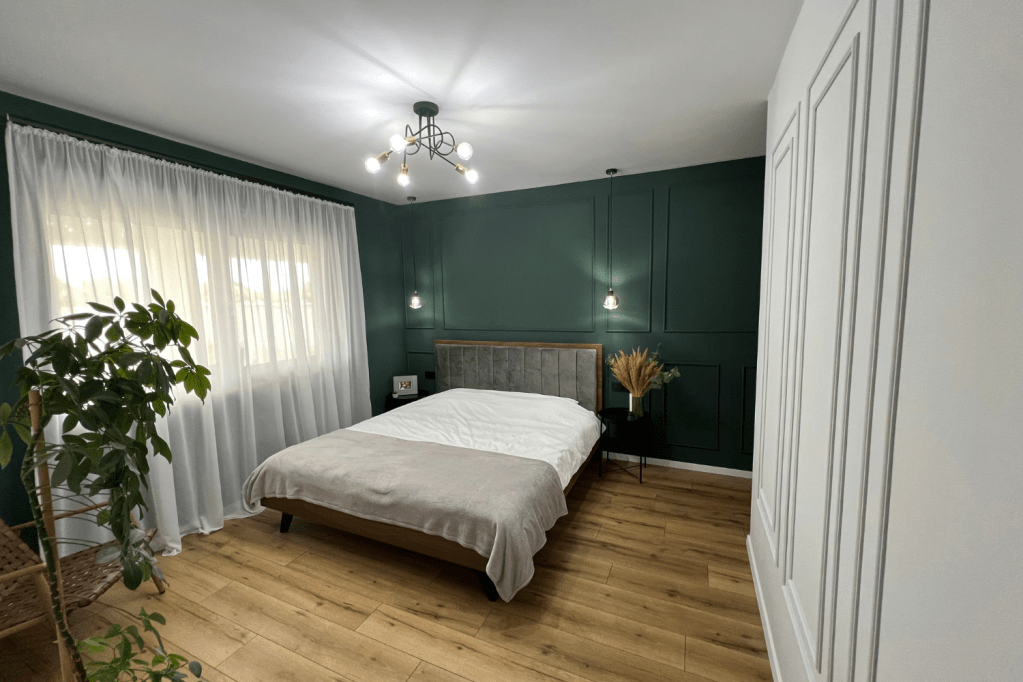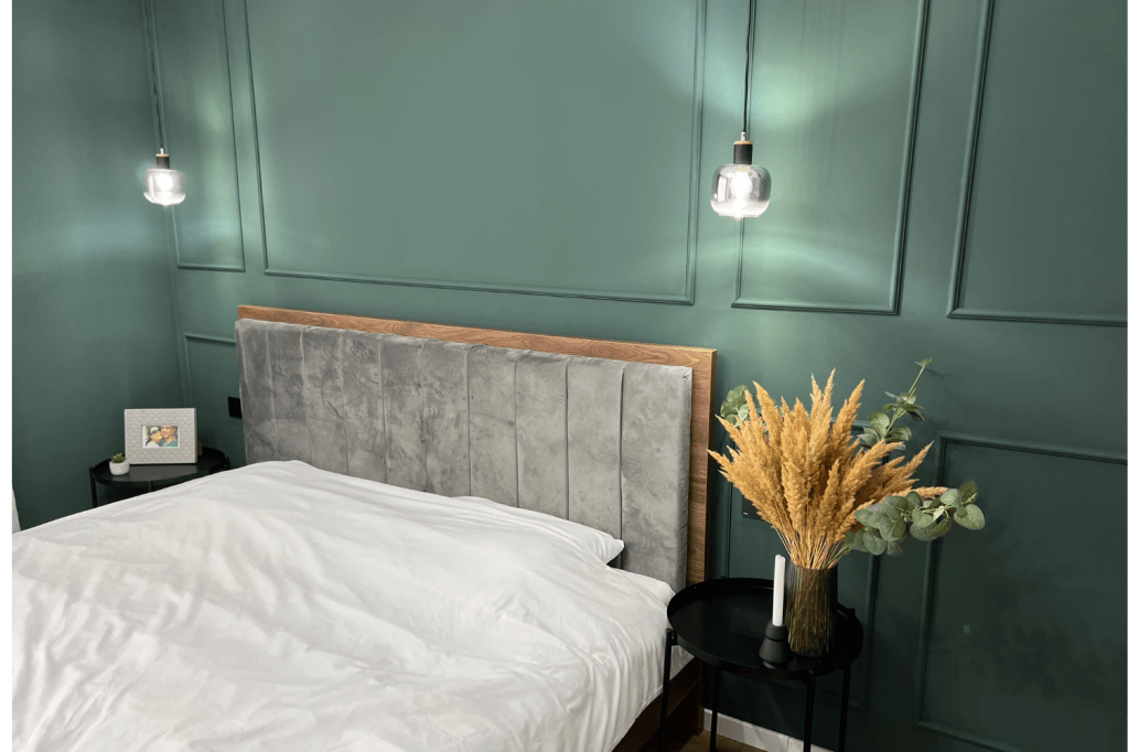 Proiectul DIY pe care l-ai făcut pentru casa ta: Sunt mândră, în mod deosebit, de oglinda mea în stil industrial, dar mai am și alte proiecte care îmi plac. De exemplu, peretele accent din dormitor.