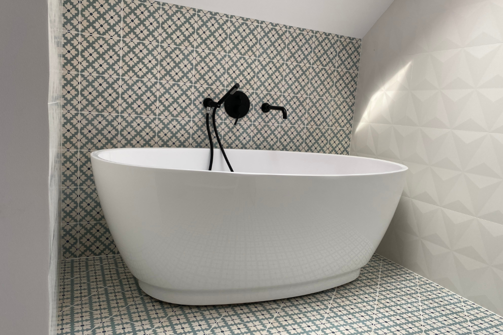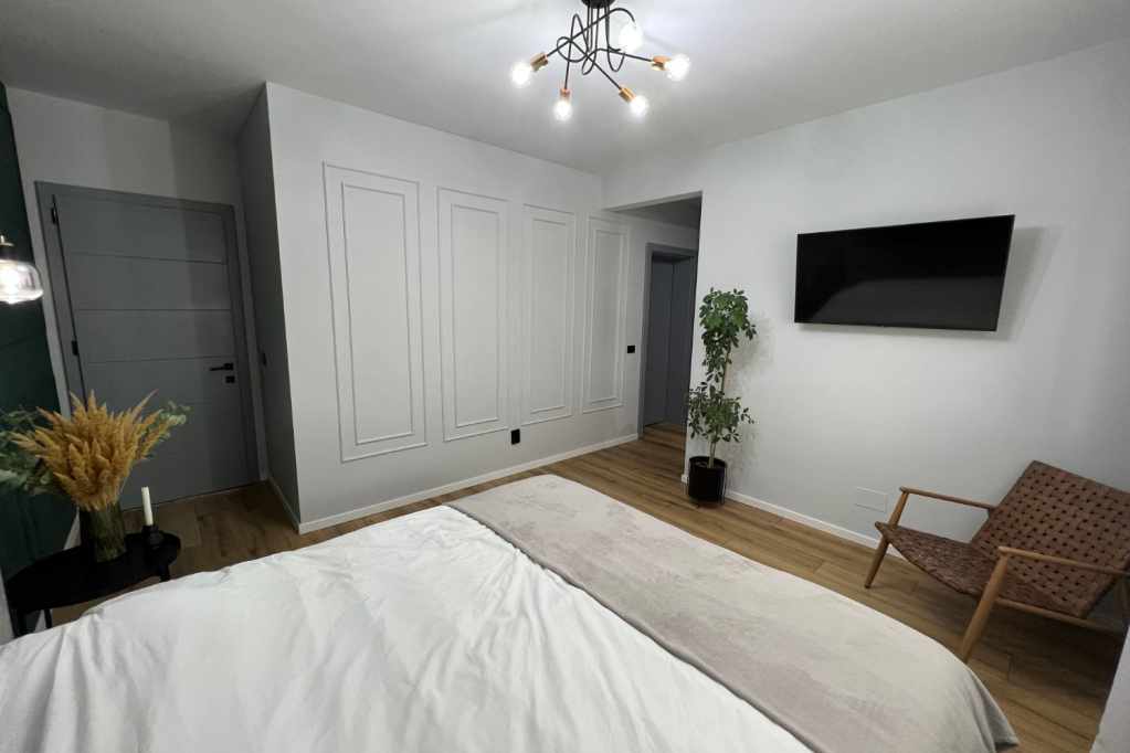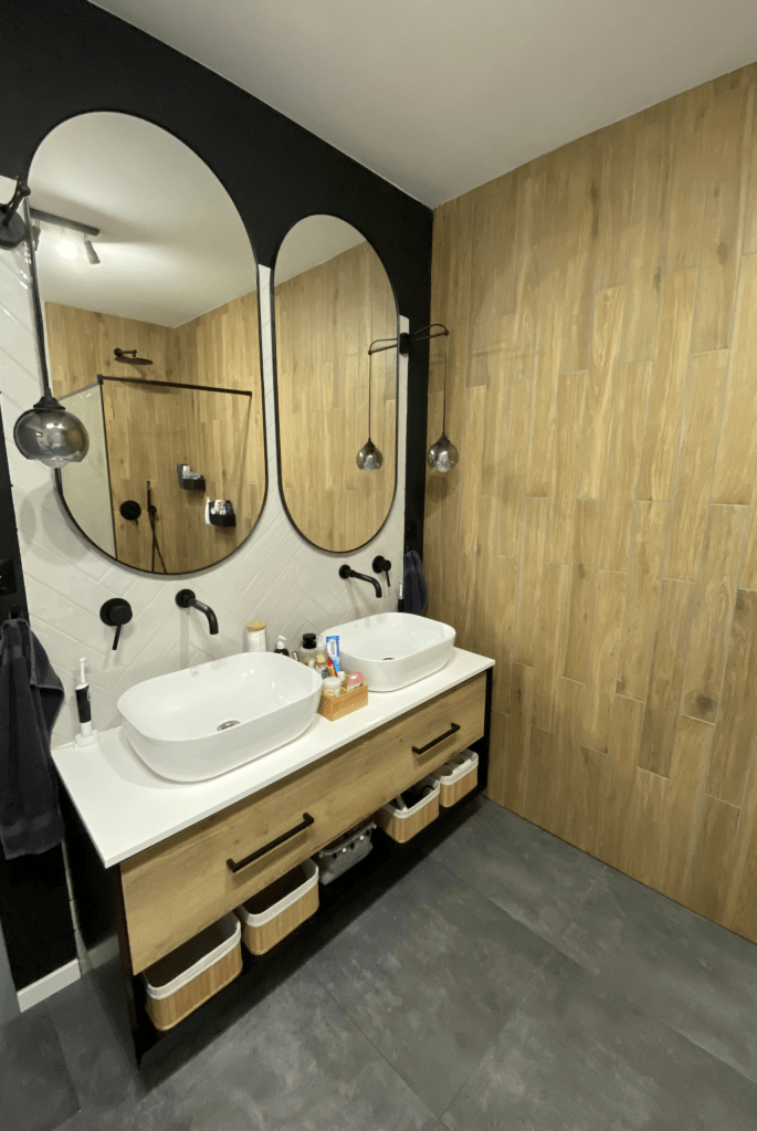 În ceea ce privește finisajele, Raluca a încercat să găsească un echilibru între practic și estetic. În zona de open space, a optat pentru gresie care imită parchetul chevron, în timp ce în dormitor a folosit pachet laminat.