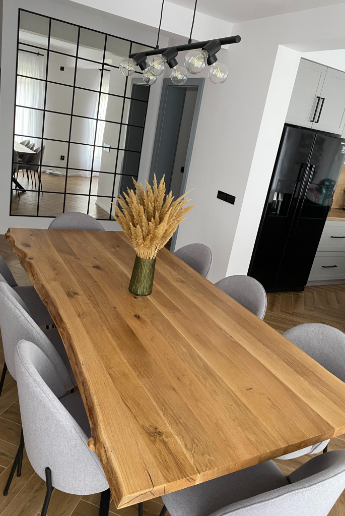 Elementul preferat: Nu pot alege un singur element. Îmi place foarte mult cum a ieșit bucătăria, am gândit-o și am visat-o mult timp. Masa de dining este un punct de atracție datorită aspectului nefinisat.
