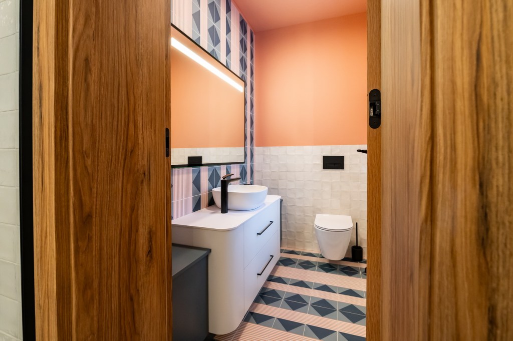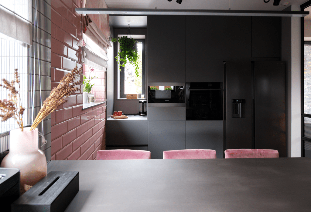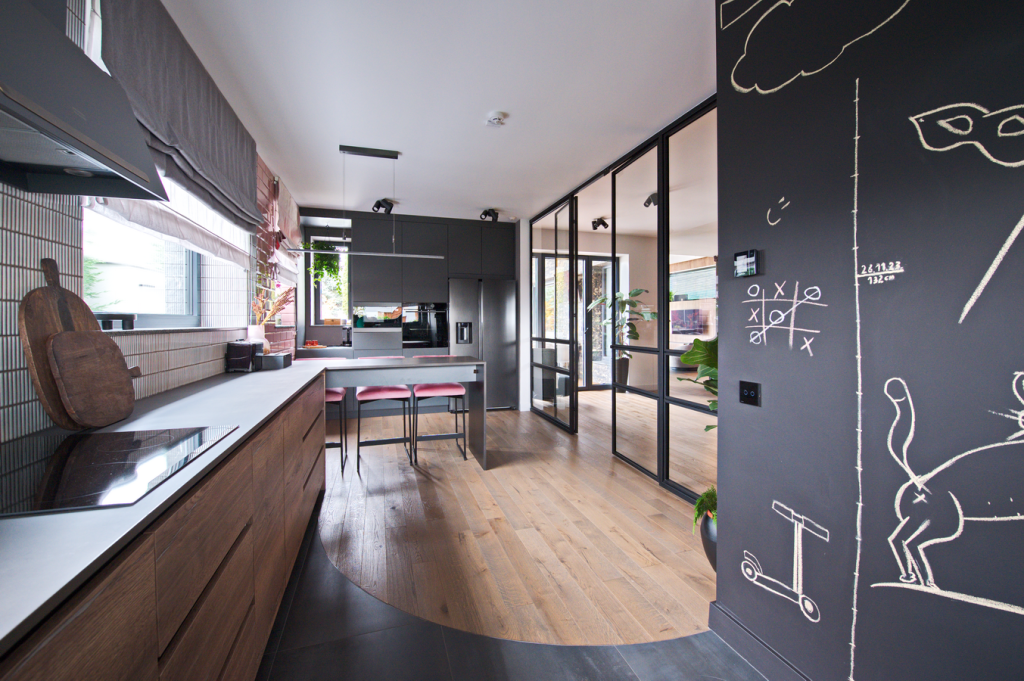 Bucătăria este o încăpere dispusă pe lungime, cu mobilier gândit sub forma literei „U”. Amenajarea se caracterizează prin asocieri neașteptate, elemente ludice și un joc al contrastelor. Cromatica este predominant sobră, dar înveselită prin accente de roz, integrate ingenios la nivelul scaunelor de bar și a unei porțiuni de perete, placată cu faianță roz. Pentru podeaua din bucătărie, Simona a folosit parchet din lemn masiv și gresie neagră. Interesantă este însă trecerea de la un material la altul, evidențiată printr-un model geometric. Ușile de sticlă, cu cadru metalic, separă bucătăria de living, dar fără să îi izoleze pe cei care folosesc spațiul.