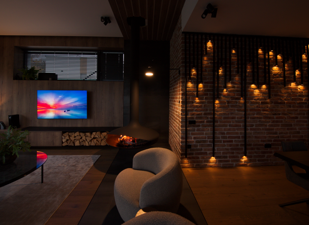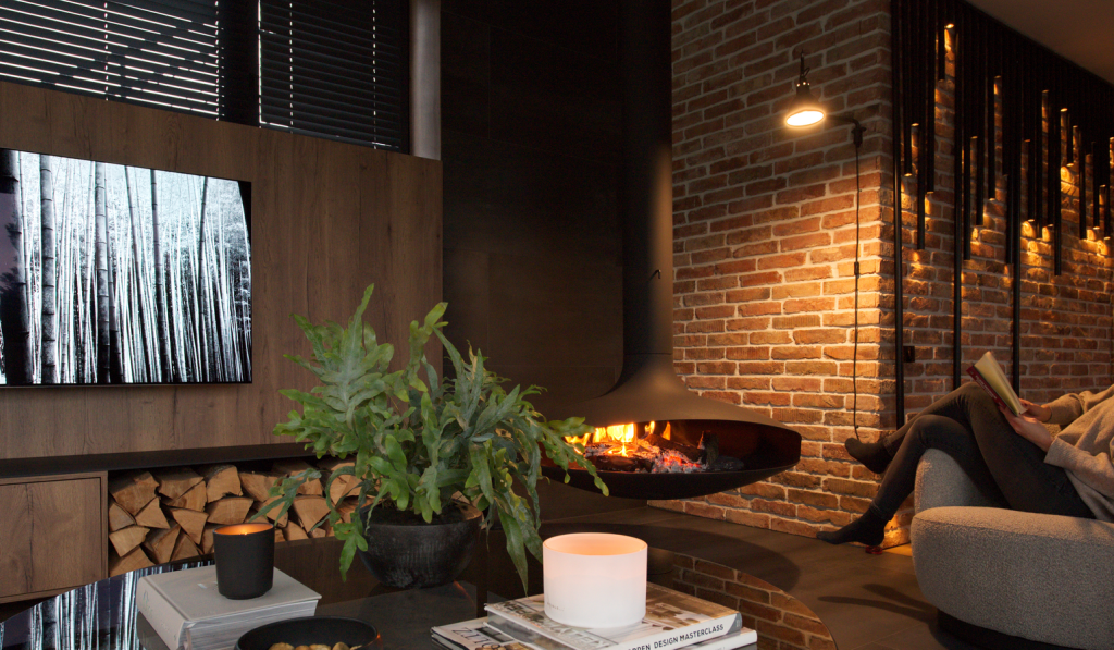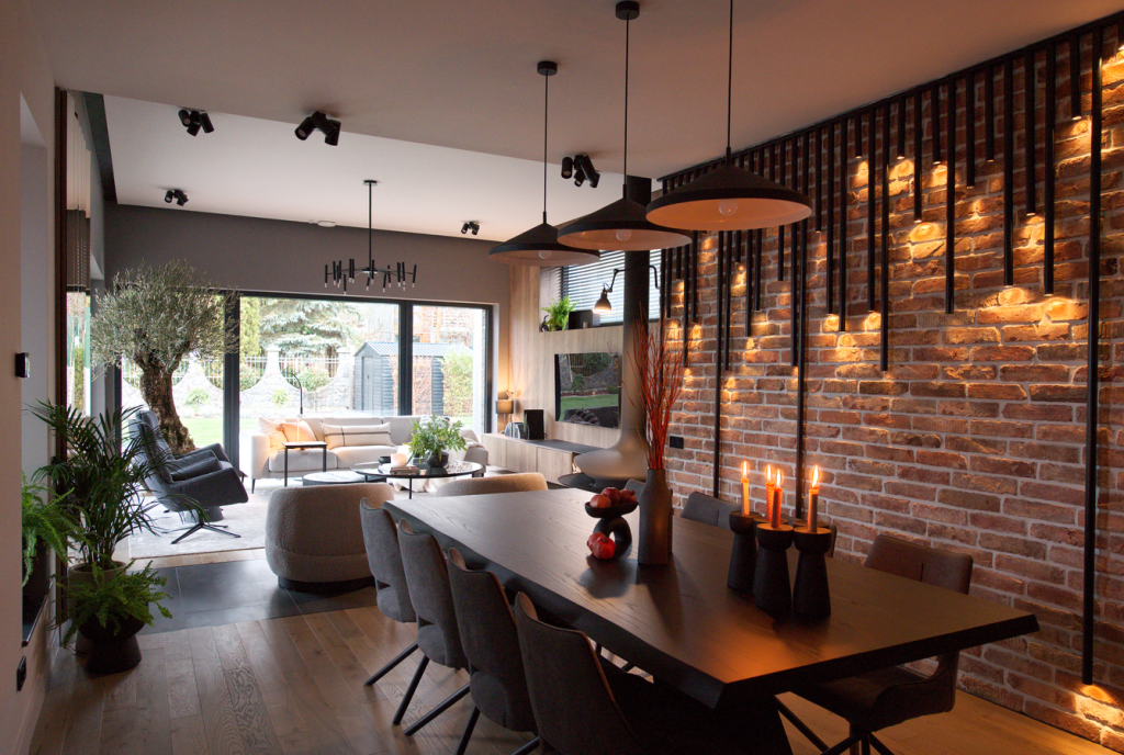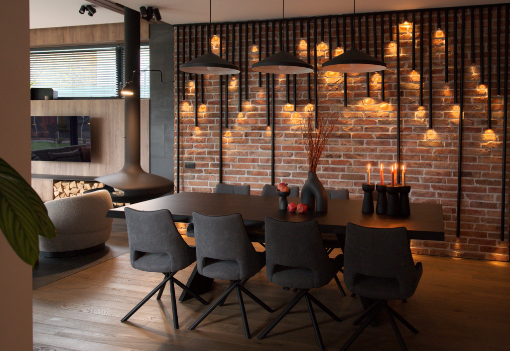 Din punct de vedere estetic, amenajarea parterului reprezintă un mix de elemente și texturi neașteptate. Predomină lemnul, asociat cu inserțiile de cărămidă recuperată și detalii industriale. Piesele de mobilier, în schimb, au culori neutre, atemporale. Există mai multe puncte de focus în această parte a casei. În primul rând, șemineul suspendat. Apoi, corpurile de iluminat, improvizate din țevi, care evidențiază foarte bine frumusețea cărămizii recuperate. Covoarele din toată casa sunt achiziționate de pe www.nesting.ro.