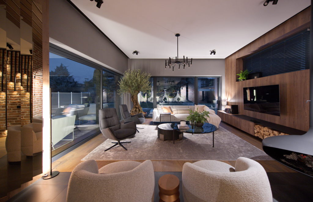 „În living, am încercat să conturez un spațiu flexibil”, explică Simona. „Am integrat fotolii rotative, pentru că avem mai multe zone de interes. Am plecat de la ideea de a oferi acces rapid pentru fiecare variantă. Adică poți să privești peisajul de afară, să te bucuri de priveliștea asupra orașului sau pur și simplu, să admiri focul arzând în șemineu, fără să te plimbi dintr-o parte în alta. Vis-à-vis de focarul rotativ am gândit un sistem de oglinzi înguste care sunt mobile. Este un truc care te ajută să vezi focul din șemineu din orice unghi al casei”.
