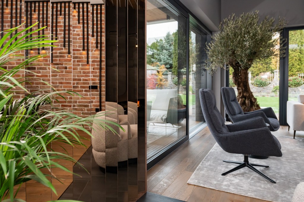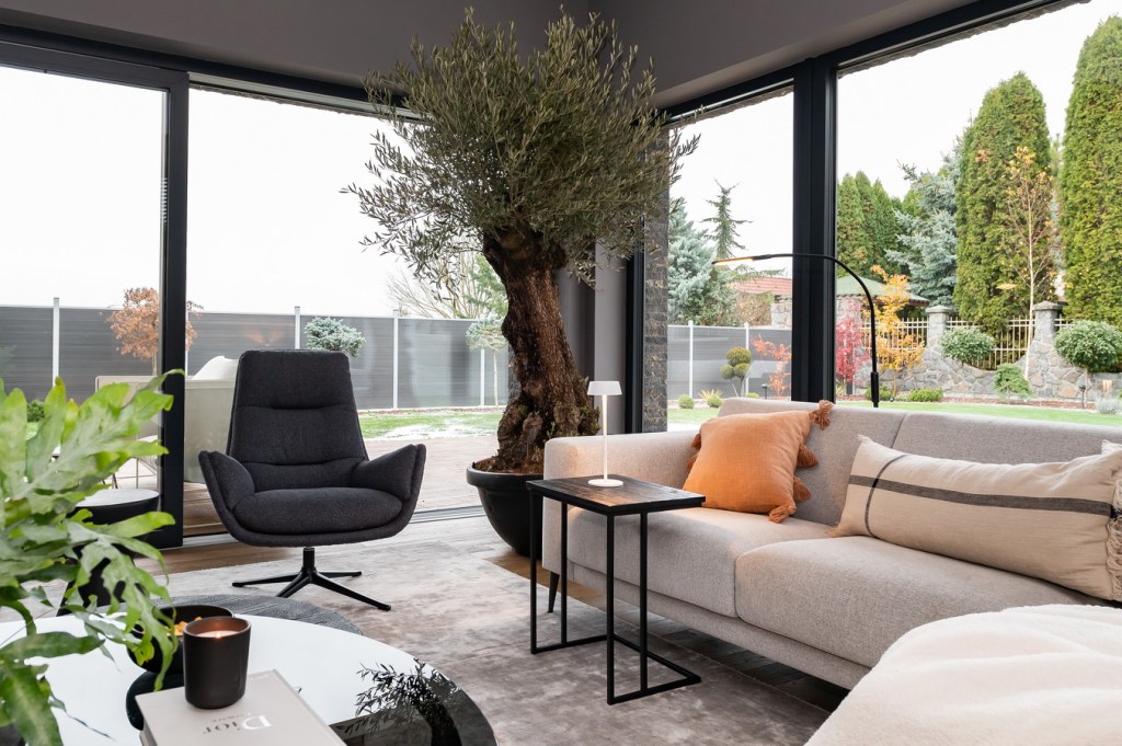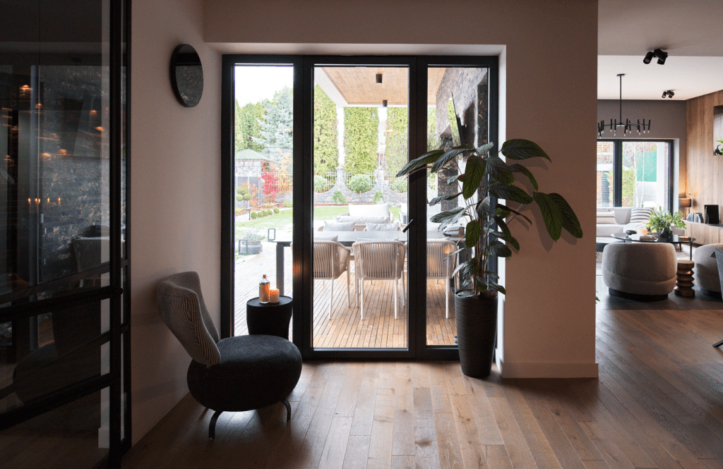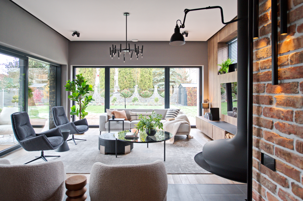 „Ferestrele de la parter unesc interiorul și exteriorul”, spune Simona. „Practic, grădina face parte din decorul livingului. Asta este partea cea mai frumoasă a proiectului, comunicarea atât de firească dintre cele două medii. Nu este doar impactul vizual, ci și libertatea pe care o oferă această legătură”.
