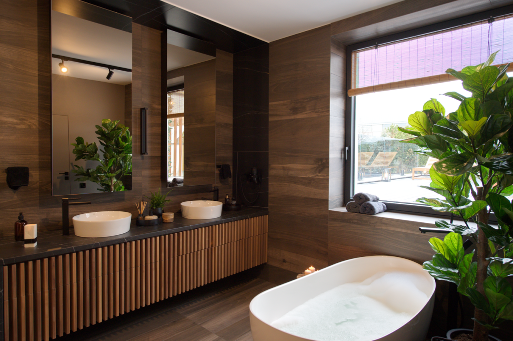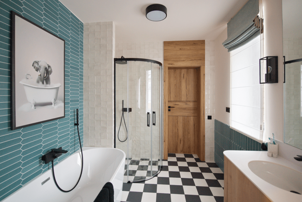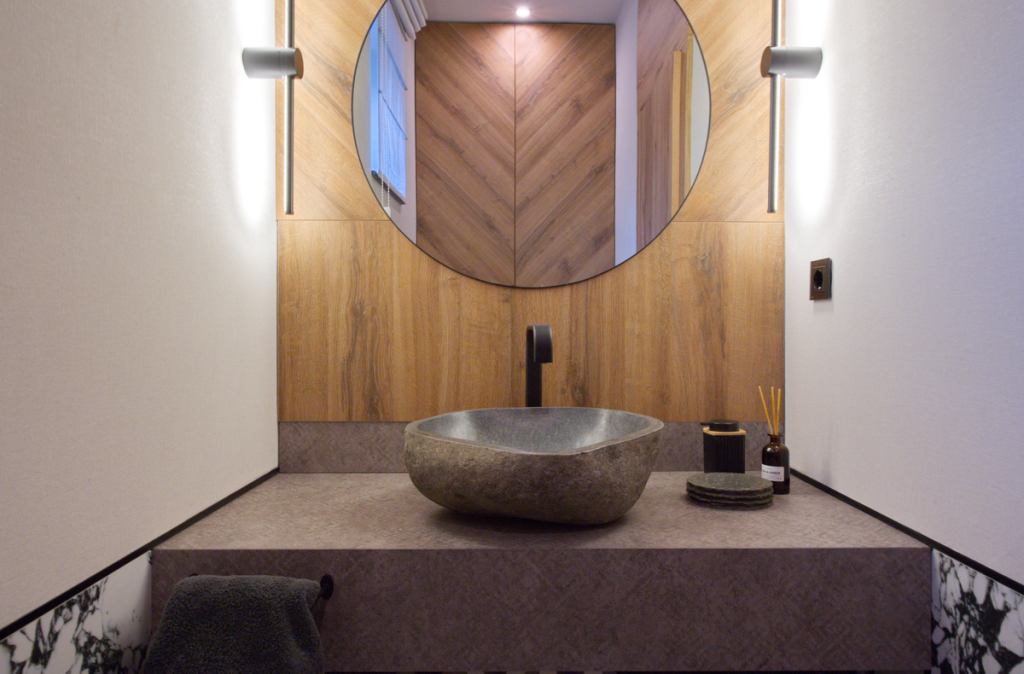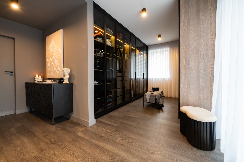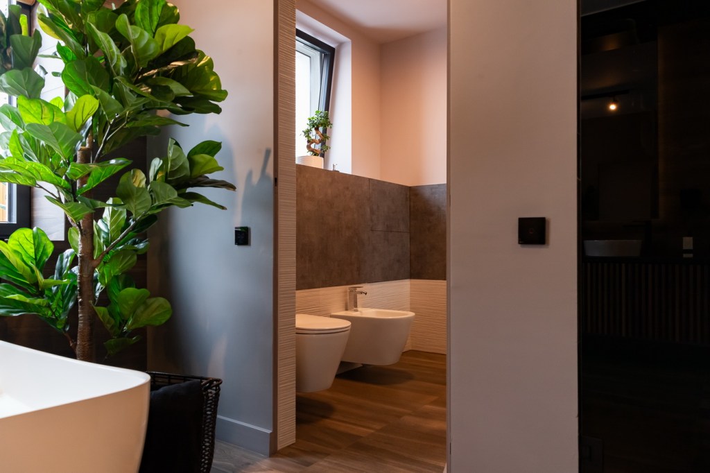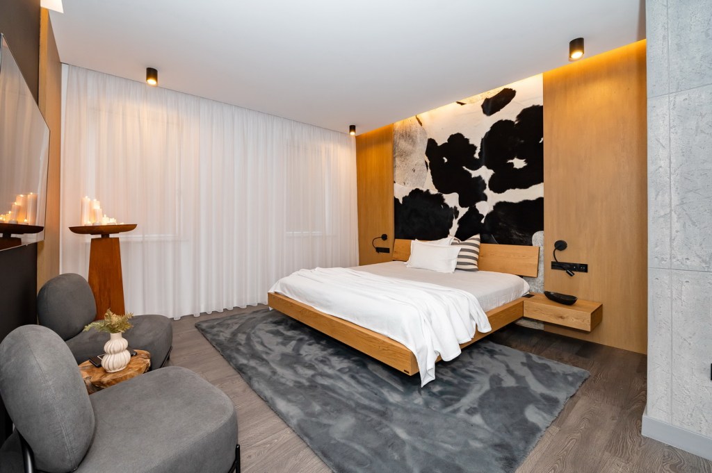 În dormitorul matrimonial, Simona a mers pe un contrast lemn – beton aparent și a folosit ca punct de focus pielea naturală de vită care marchează zona patului. Dormitorul include un dressing generos și o baie cu vedere către terasă. Baia este gândită ca un spa cochet, cu mult lemn și plante naturale. Elementul funky de aici este tapetul cu balenă, pe fundal negru. Interesantă este și ideea Simonei de a separa toaleta de restul încăperii, concept folosit și în baia copilului.