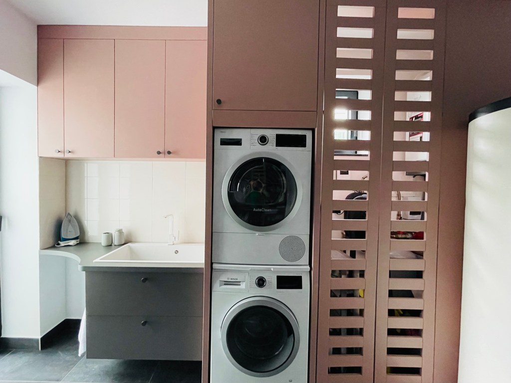 Tot la parter mai există o cameră utilizată ca spațiu tehnic. Este o încăpere spațioasă în care se află mașina de spălat, uscătorul de rufe, o chiuvetă și dulapuri folosite pentru depozitare. Mobilierul roz pudrat continuă cromatica din bucătărie. Componentele centralei și lucrurile care nu s-au dorit a fi lăsate la vedere, sunt ascunse în spatele unor uși riflate. Este o cameră care are parte și de lumină naturală.