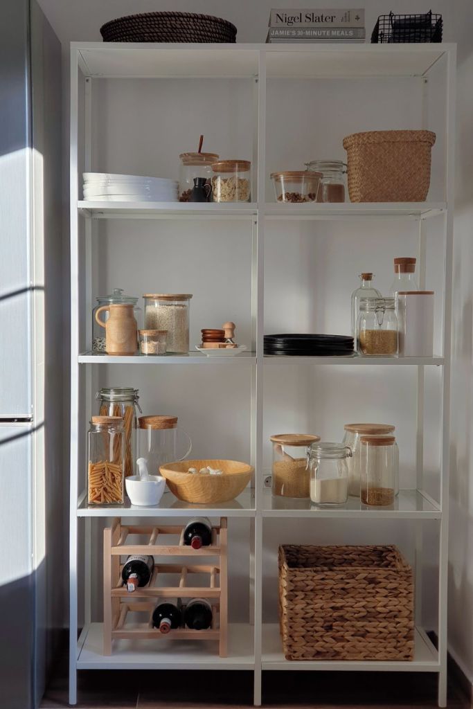 Pentru a nu fi doar frigiderul pe un perete, au integrat și o etajeră albă, cumpărată din IKEA, pe care să expună diverse lucruri drăguțe din bucătărie, precum borcane, cărți sau sticle de vin.