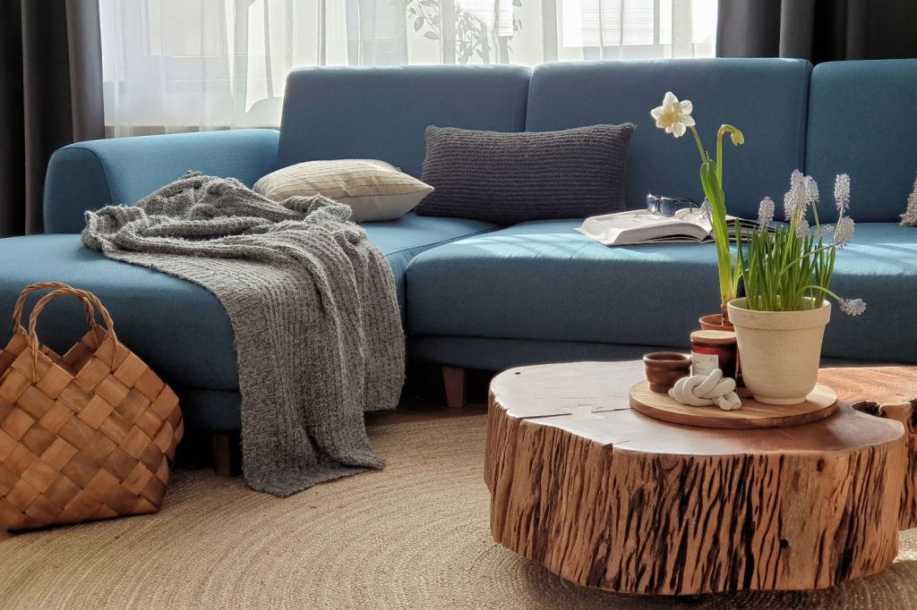 În living, amenajarea a pornit de la canapeaua albastră, cumpărată de la Mobila Dalin. Și-au dorit un model pe care l-au mai avut, știind cât de bine se păstrează în timp. Având dimensiuni mai mari față de fosta canapea, nu au putut să o poziționeze în același loc, așa că au așezat-o în fața ferestrelor.