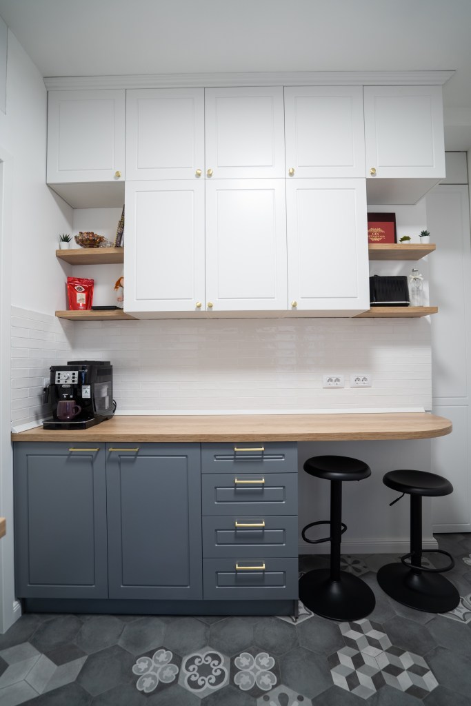 „Beneficiarii și-au dorit un loc de luat masa, spații verticale pentru depozitare și loc pentru electrocasnice. Astfel, a trebuit să ridicăm caloriferul deasupra blatului de lucru, am poziționat cuptorul cu microunde pe o poliță suspendată, ca să lăsăm loc liber pe blat. Forma bucătăriei nu a permis încorporarea frigiderului, așa că acesta e pe hol”, explică Andreea.