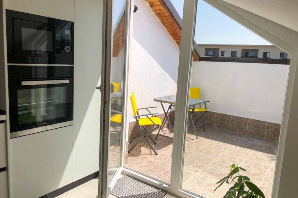 Pentru zona de dining au ales setul Evdemo Alb de pe QHome care conține atât masa albă, cât și cele patru scaune din fier, negre. Dragoș și-a dorit combinația de alb – negru, pentru a oferi un efect minimalism locului, dar și pentru a se potrivi cu nuanțele mobilierului de bucătărie. Însă Marian a reușit, prin intermediul peretului galben, să păstreze efectul minimalist, dar și să ofere locului o personalitate aparte.