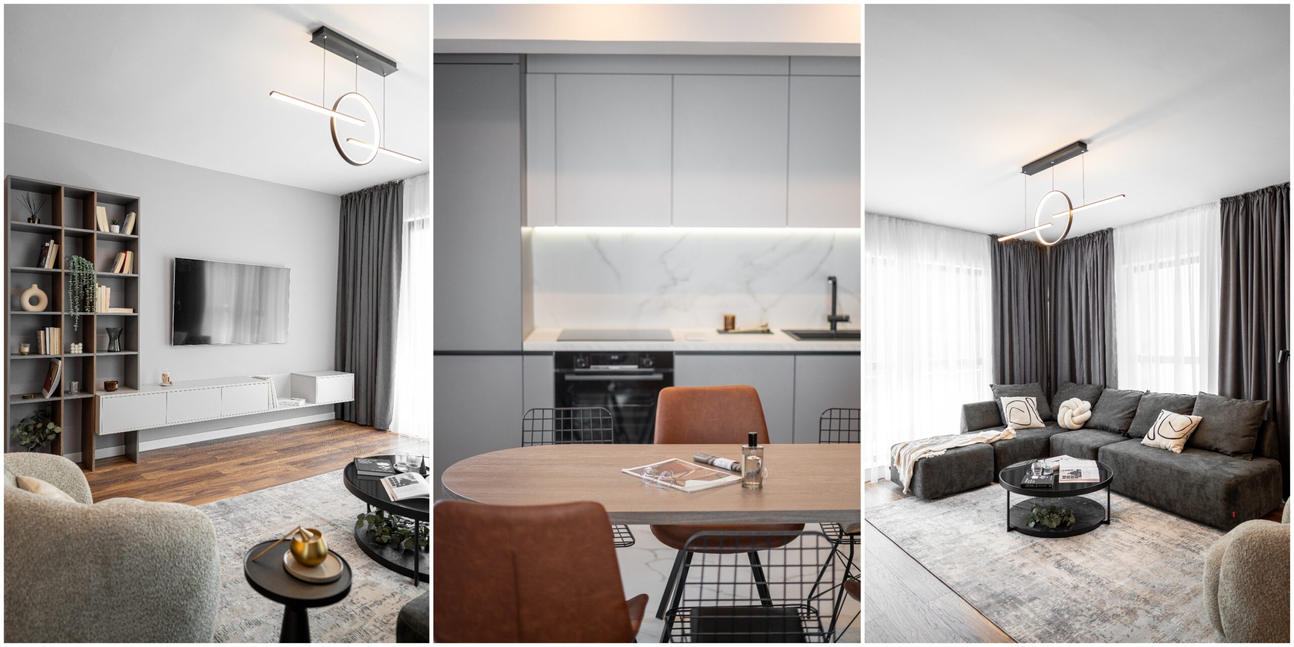 Amenajarea unui apartament din Pipera a avut 3 criterii: culori închise, ușor de întreținut, șantier scurt și multe spații de depozitare