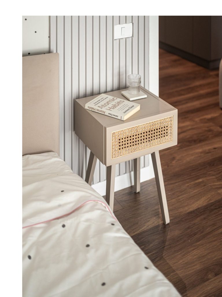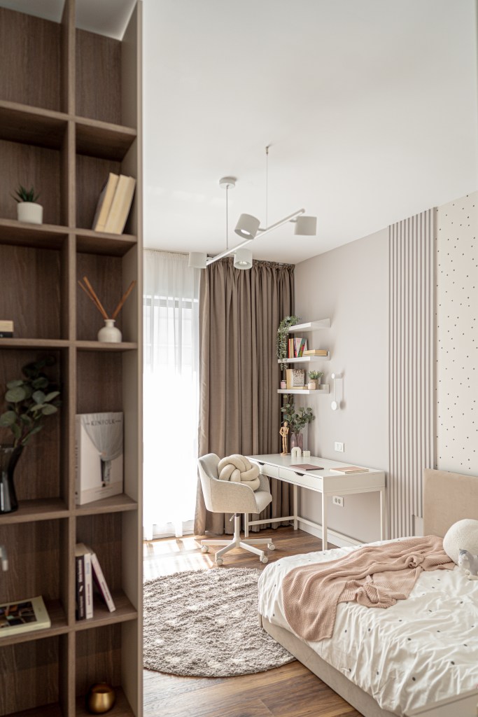 Dormitorul matrimonial are dimensiuni generoase și lumină naturală din abundență, ceea ce a permis o amenajare care să pună accent și pe partea de funcționalitate. Andreea a profitat de configurația încăperii pentru a adăuga spațiu suplimentar de depozitare, cu ajutorul mobilierului custom-made. La sugestia Elenei și a lui Robert, a integrat, în dormitor, și un spațiu de lucru, orientat către fereastră. Camera Siei are o cromatică mai blândă, iar designul a fost gândit pentru a fi relevant și când micuța va crește. Amenajarea a fost ceva mai dificilă aici, încăperea fiind dispusă pe lungime.