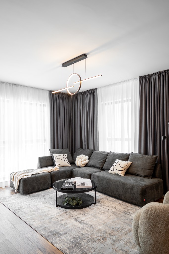 O mare reușită a proiectului este atmosfera caldă și relalxată, obținută prin soluții de depozitare care nu domină decorul, prin textile și prin atenția acordată detaliilor. E o amenajare cu note elegante și linii predominant minimaliste. Andreea a echilibrat culorile închise cu tonuri blânde de alb, beige sau gri, iar pentru un plus de căldură a adăugat inserții mici de lemn. Mobilierul este realizat pe comandă, în tot apartamentul, ceea ce a permis crearea unor soluții personalizate în detaliu în funcție de nevoile beneficiarilor. Destul de dificilă a fost eficientizarea zonei de intrare, gândită, la începutul șantierului, ca un spațiu deschis, comun cu bucătăria și cu livingul. Andreea a reușit să proiecteze aici corpuri de mobilier care să înlocuiască tradiționalul cuier din hol. Astfel, hainele de exterior și încălțămintea rămân ascunse, păstrând spațiul aerisit și organizat.