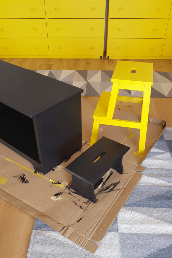 Așa am ajuns la Benjamin Moore, unde am petrecut ceva vreme analizând paletarul în căutarea galbenului perfect. Sparkling yellow a câștigat și, după cele două comode, a urmat și un scăunel. Ceva mai târziu am vopsit și corpurile ce țin loc de cuier și pantofar, de data asta în negru.