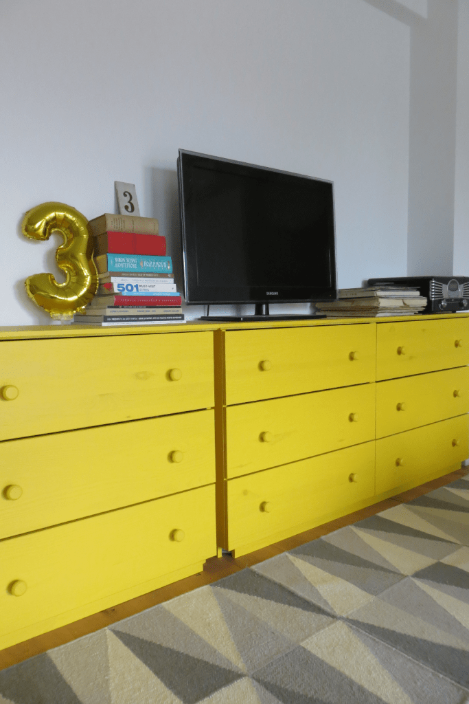 Proiectul DIY pe care l-ai făcut pt apartament: am vopsit niște mobilă. Și după am mai vopsit niște mobilă. Totul a început de la comodele din living. Am zis inițial că merg doar pe tonuri naturale, dar după ceva vreme de locuit efectiv în casă am simțit nevoia de culoare. Și m-am setat pe niște comode galbene. Cum ce găseam online fie nu era culoare dorită, fie era prea scump, am decis până la urmă să iau niște comode simple de la IKEA și să adaug vopseaua.